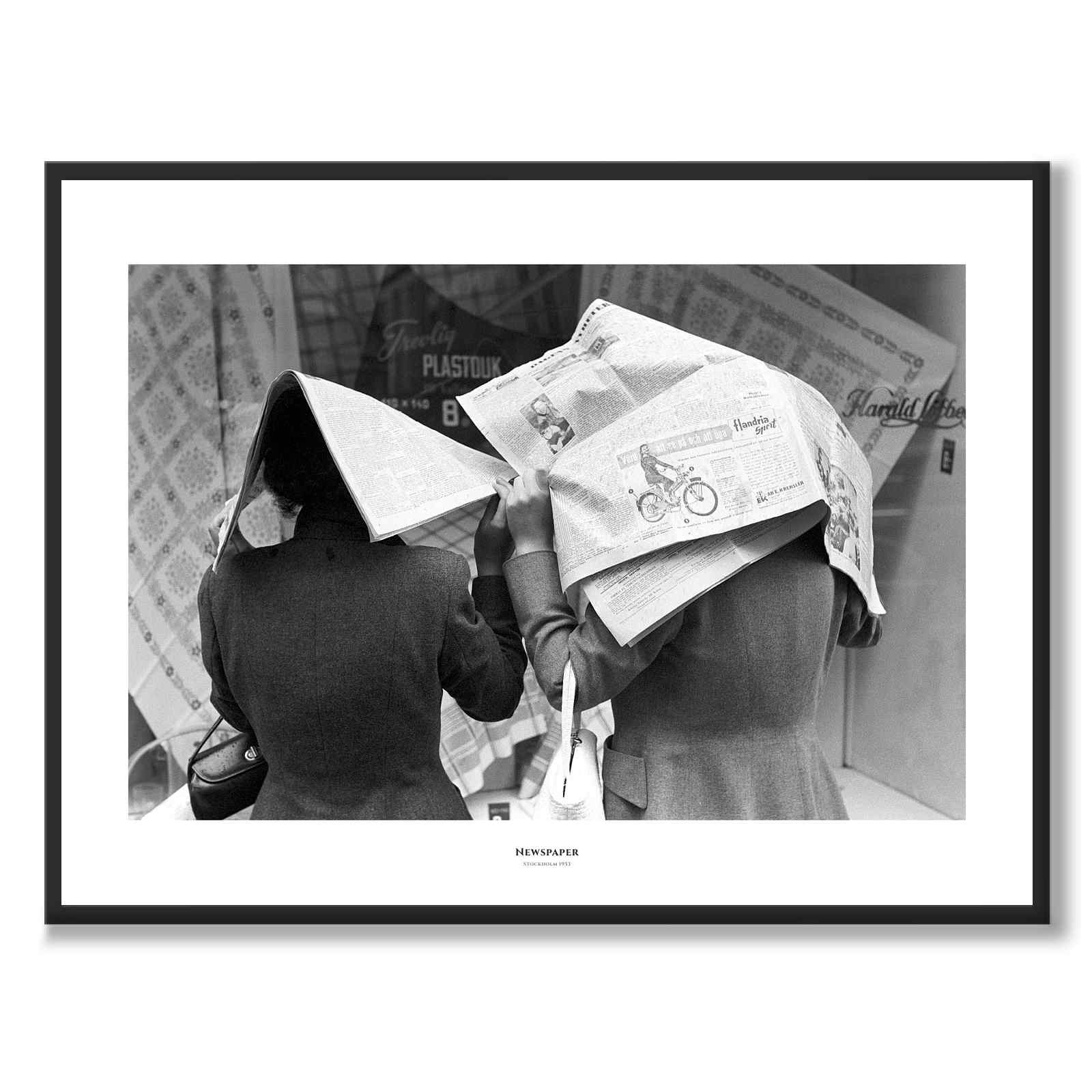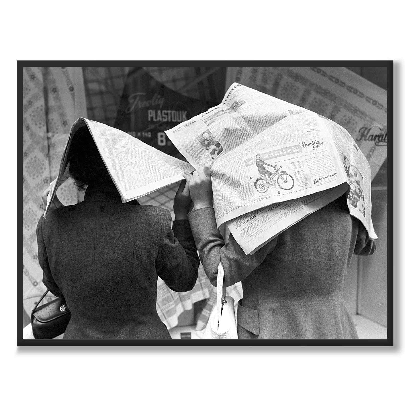 Poster med en ögonblicksbild i Stockholm på 1950-talet. Det är en regnig dag och två kvinnor försöker undvika bli blöta genom att hålla dagstidningar över sig. En annons syns tydligt för den belgiska mopeden Flandria Sport. Året är 1953.