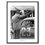 Poster med ett vintage fotografi som visar en kvinnlig förare i en bil med nummer 23 som ler och kikar ut från fönstret. En funktionär står framför bilen och viftar med en flagga, antingen för att välkomna bilen i mål eller för att starta rallyt. Bakgrunden visar en byggnad med en reklamskylt för Shell.