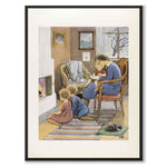I boken står det: Nu rister stormen trädens nakna grenar. Uhi uho — — — De sista skrumpna bladen han förmenar bli kvar i ro. Med vadd vi klistrat våra innanfönster och remsor på. Snart målas de i granna isblomsmönster så isig grå. Fast frosten bitit allt på åkerrenen, är ännu tö, men mormor säger, att det känns i benen, att snart blir snö. Nu ska vi strax en duktig brasa göra, och sen jag tror, vi får en lång och rolig saga höra, säj, snälla mor?