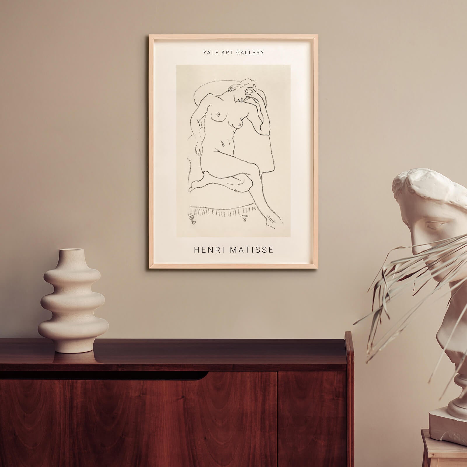 Poster med en vintage nude sketch av Henri Matisse. Motivet heter Nude sitting in a chair, one leg folded (1922) och visar en naken kvinna som poserar sensuellt. Originalet finns vid the the Yale University Art Gallery.