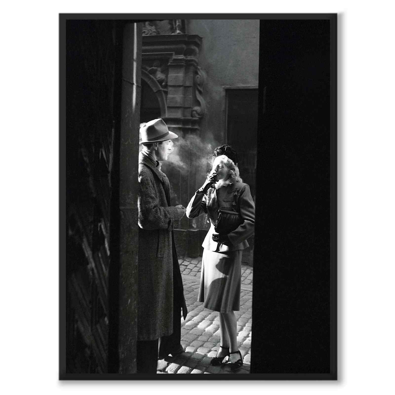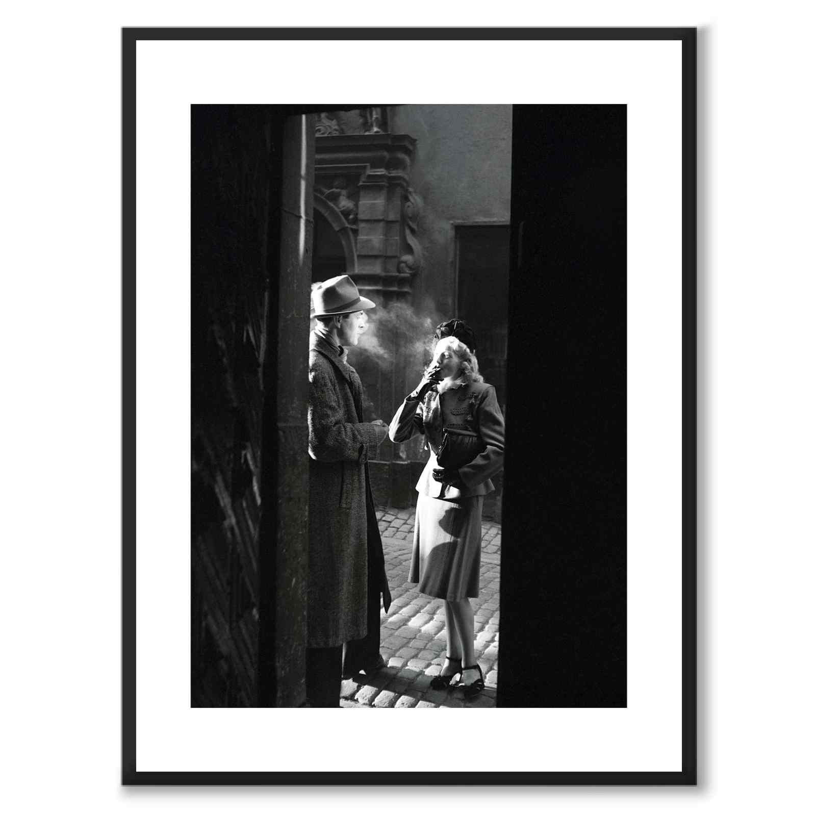 Poster med en gammal bild från Gamla Stan i Stockholm år 1946. Skådespelarna Karl-Arne Holmsten och Irene Söderblom röker mellan inspelningarna av den svenska långfilmen Hotell Kåkbrinken som hade premiär i december samma år. Solen är på väg ned vilket skapar effektfulla ljuskontraster. Skådespelarna är klädda i tidstypiska 40-talskläder.