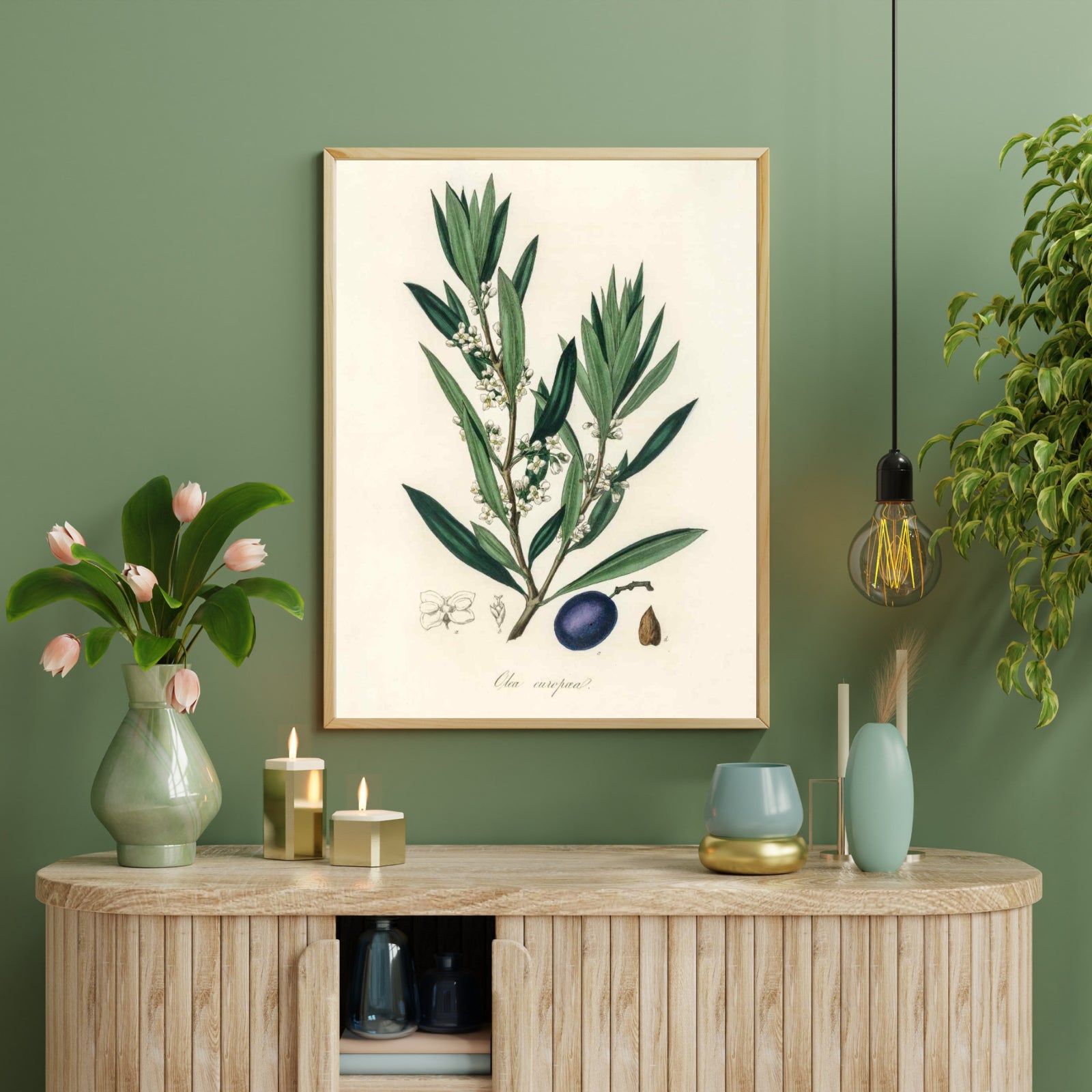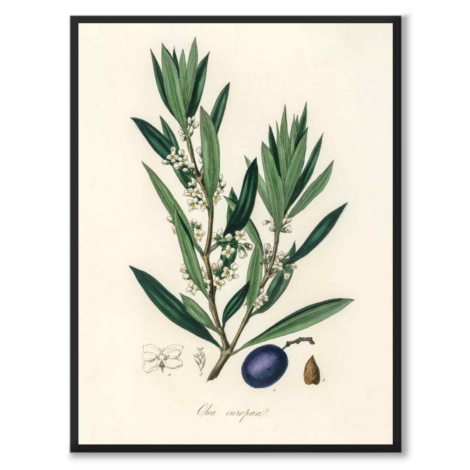 Poster med en botanisk illustration av en olivkvist från 1800-talet. Olea europaea, mer känd som olivträdet, är en ikonisk och mångsidig växt med djupa rötter i Medelhavsområdets kultur och historia.