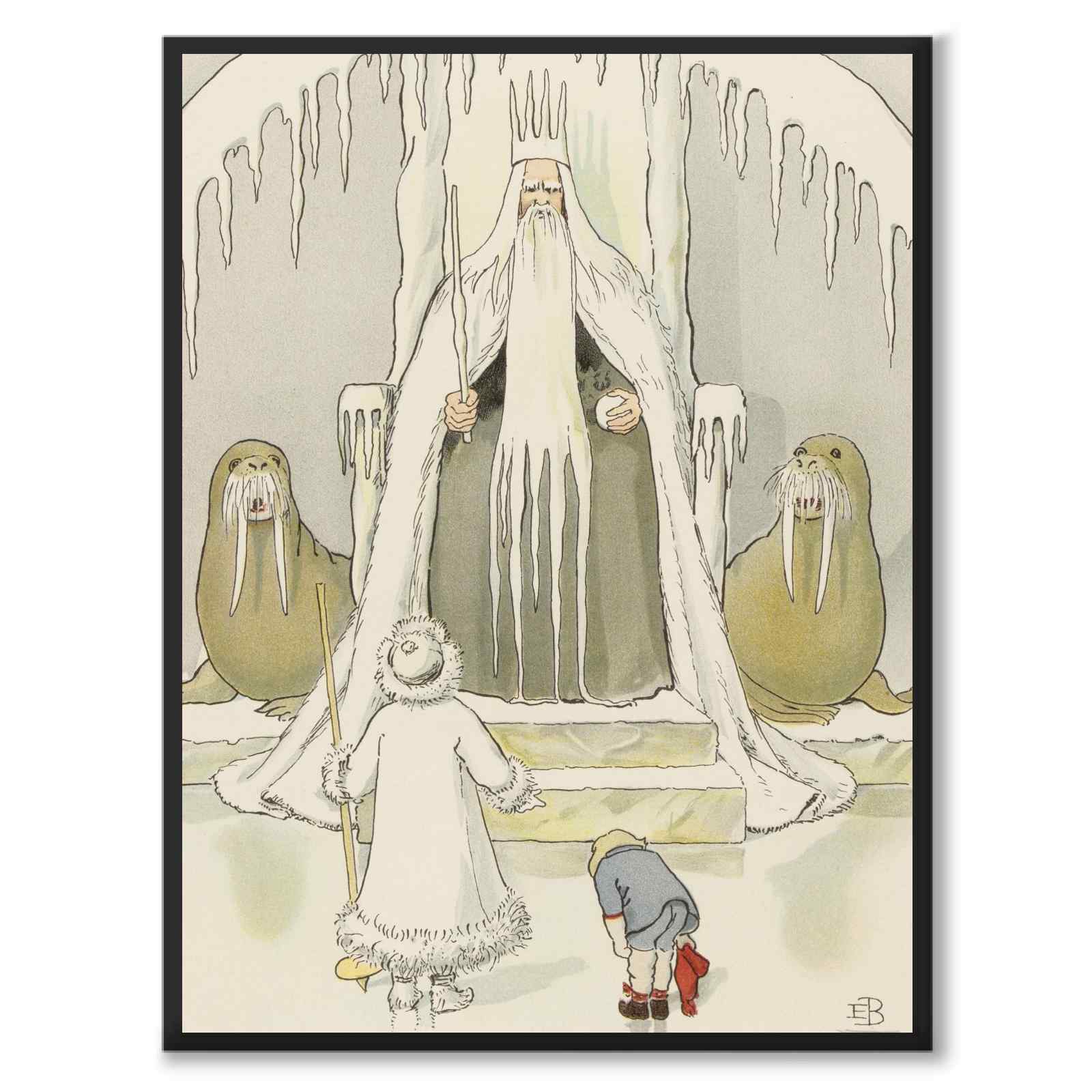 I det här motivet ser vi Olle och Farbror Rimfrost framför den mäktige Kung Bore, också kallad Kung Vinter, som sitter på sin tron omgiven av istappar och två väldiga valrossar. Kung Bore, vinterns härskare, är en symbol för vinterkylan och auktoritet. Olle bugar ödmjukt inför honom, vilket visar respekt och underdånighet inför vinterns kraft.