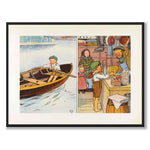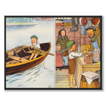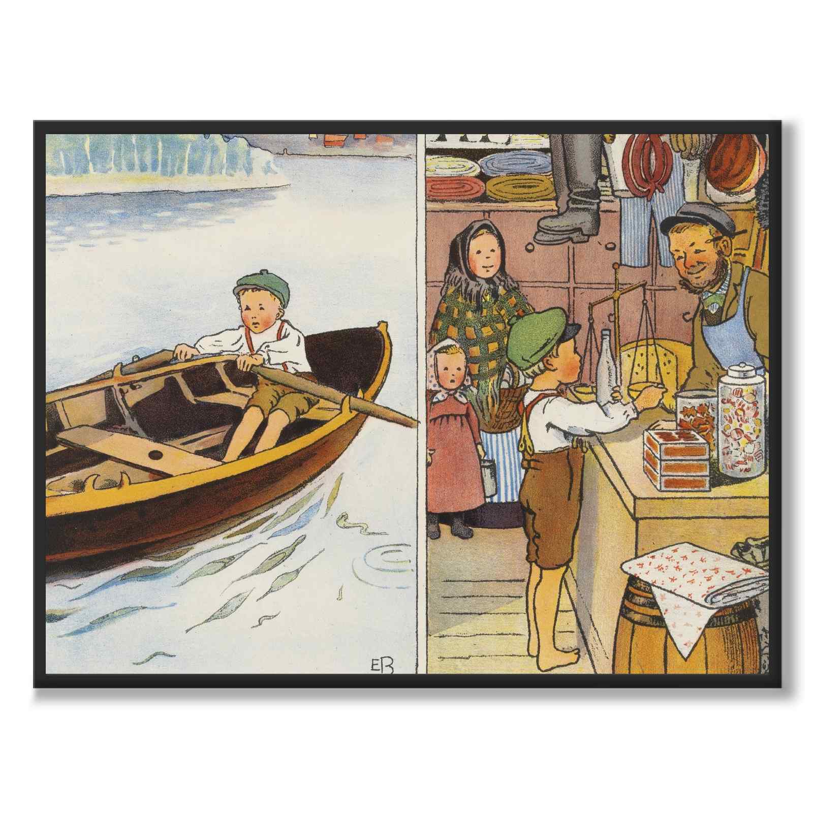 Bilden visar två scener ur vardagslivet. Till vänster syns en pojke som ensam ror en liten båt över lugnt vatten. Till höger står samma pojke i en lanthandel och handlar varor. Bilden skildrar både ansvar och självständighet i ett barns liv.