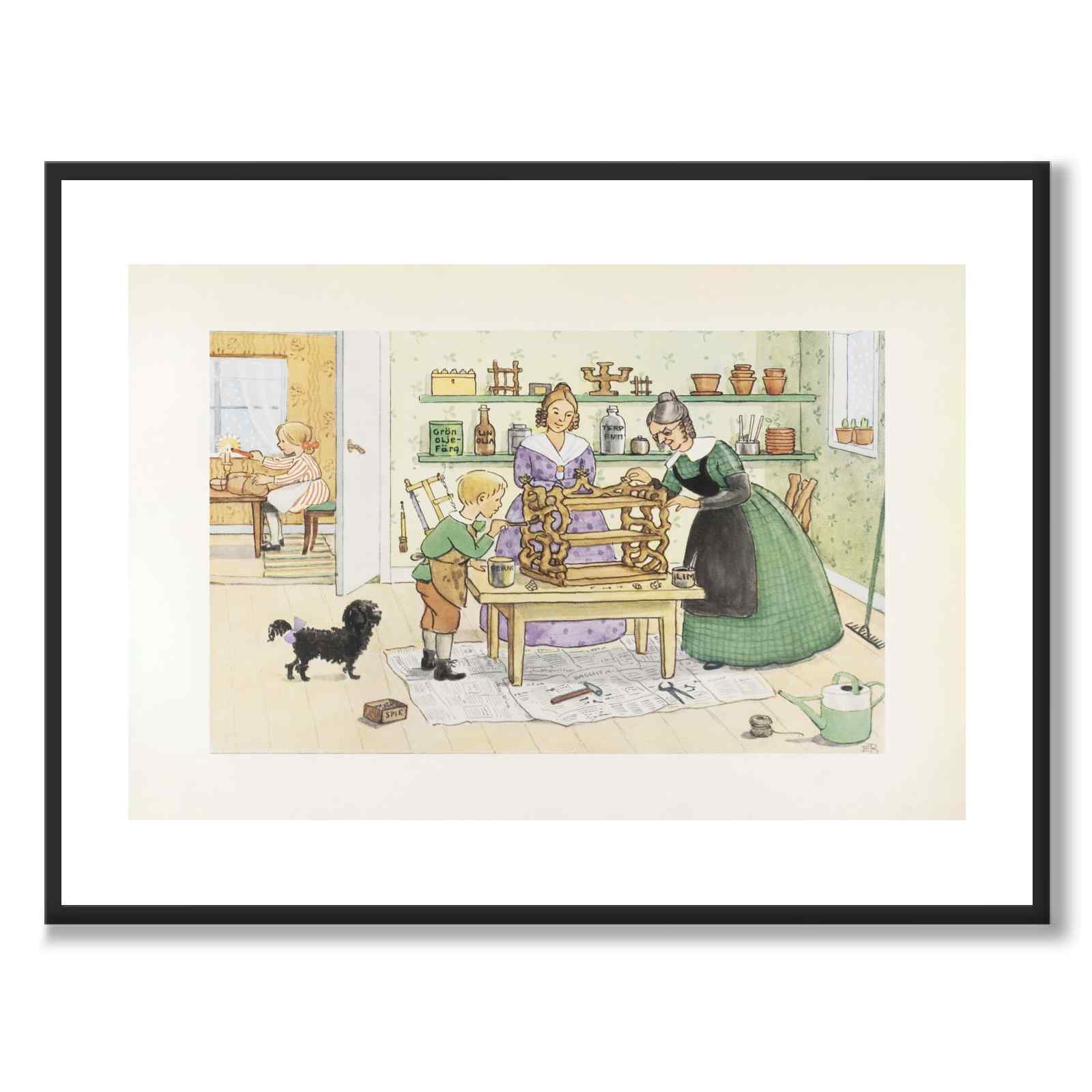 Illustrationen visar en varm och livfull julscen där barn och vuxna arbetar tillsammans i ett hemtrevligt rum. På bordet står ett stort halmarbete som dekoreras omsorgsfullt, medan rummet är fyllt av små detaljer som verktyg, krukor och färgburkar som förstärker den kreativa stämningen. En liten hund står nyfiket bredvid och bidrar till den lekfulla atmosfären som präglar motivet.