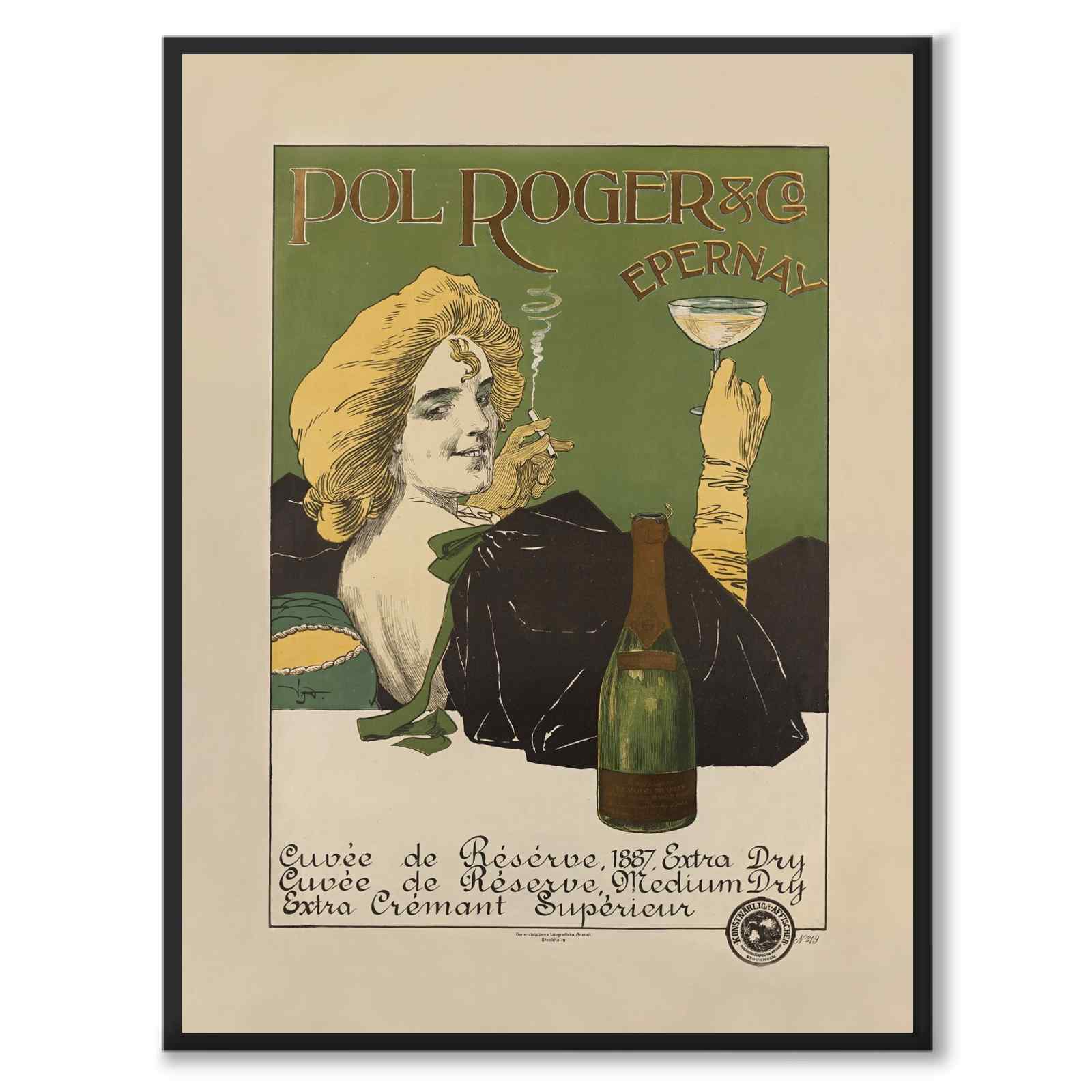 Poster med en gammal reklam för Champagnehuset Pol Roger år 1896. Pol Roger grundades 1849 i staden Épernay i Frankrike och är ett av de sista familjeägda champagneföretagen. Champagnen är känd som Winston Churchills favorit och när han dog 1965 hedrades han av Pol Roger med en sorgkant på alla flaskor som såldes i Storbritannien.