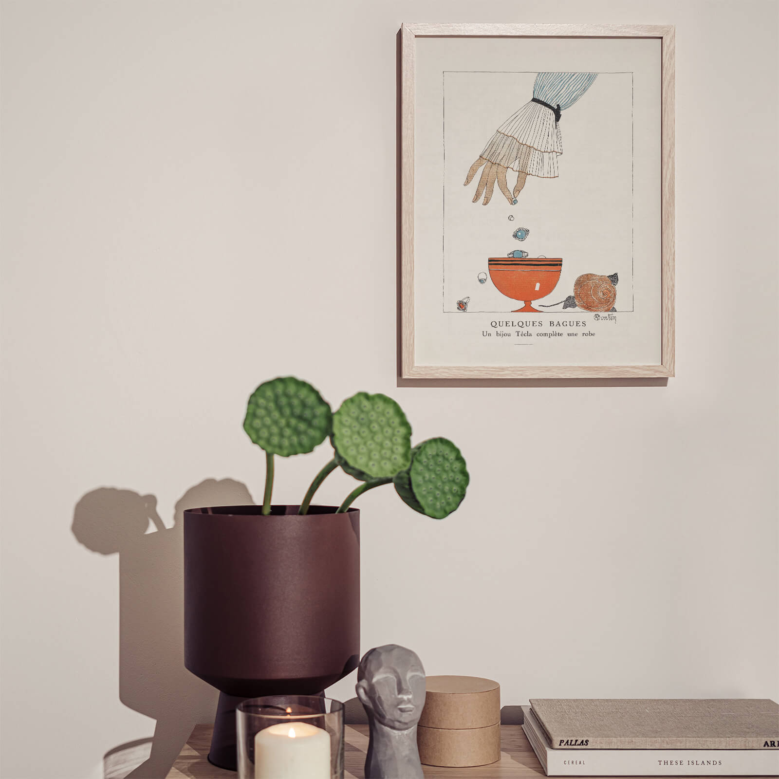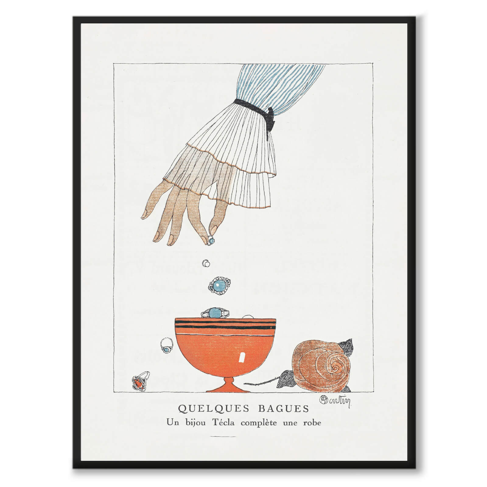 Poster med en gammal fransk reklam för ringar med juveler av Charles Martin från 1914. På illustrationen ser du texten Quelques Bagues. Un bijou Técla complète une robe. Bilden visar en kvinnas hand som släpper ner vackra ringar i en smyckesbägare.