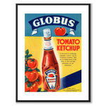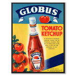 Poster med en vintage annons från 1943. Företaget Banan-kompaniet annonserar i färg för sin produkt Globus tomatketchup.