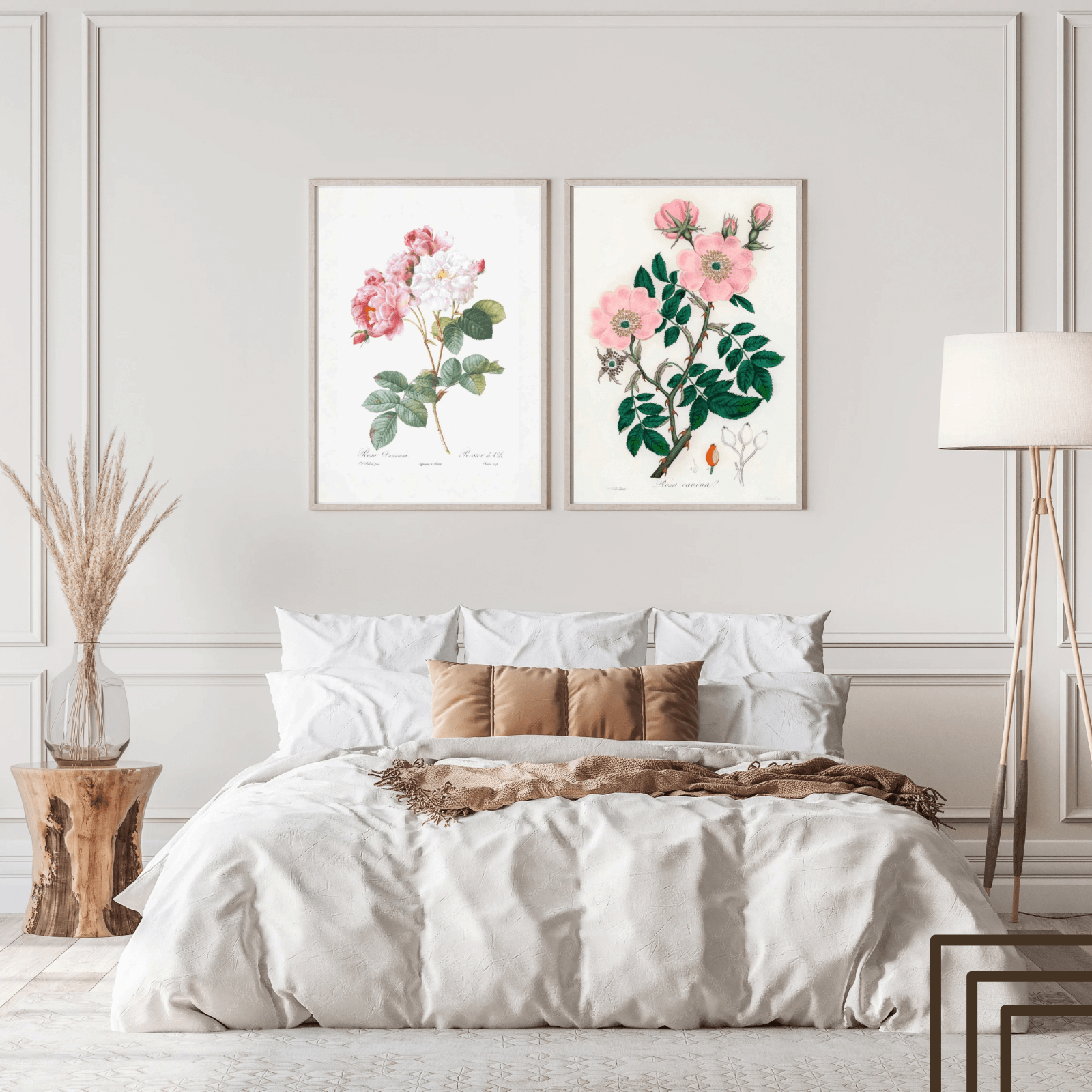Poster med motiv av illustrationen Rosa caninal. Rosa canina, även känd som hundros, spelar en viktig roll i ekosystemet som livsmiljö och föda för många djurarter. Dess blommor lockar pollinerare som bin och fjärilar, medan dess frukter är en viktig föda för fåglar och andra djur.