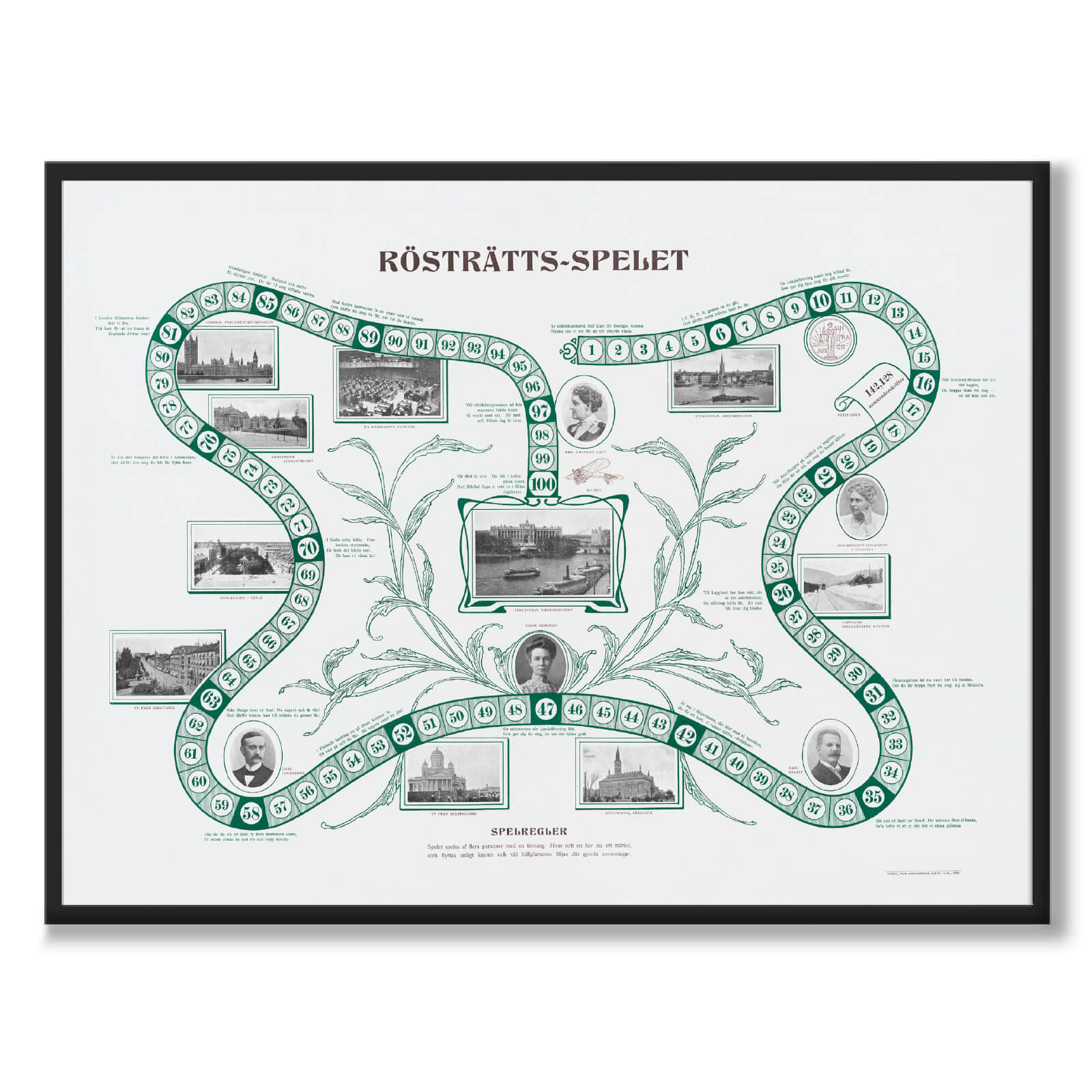 Det här motivet heter Rösträtts-spelet och är en fantastisk och stark illustration som visar kvinnorörelsens resa och framsteg i början av 1900-talet. Rösträtts-spelet föreställer ett tärningsspel och delades ut som vykort år 1910 för att propagera för kvinnors jämställdhet och rösträtt.