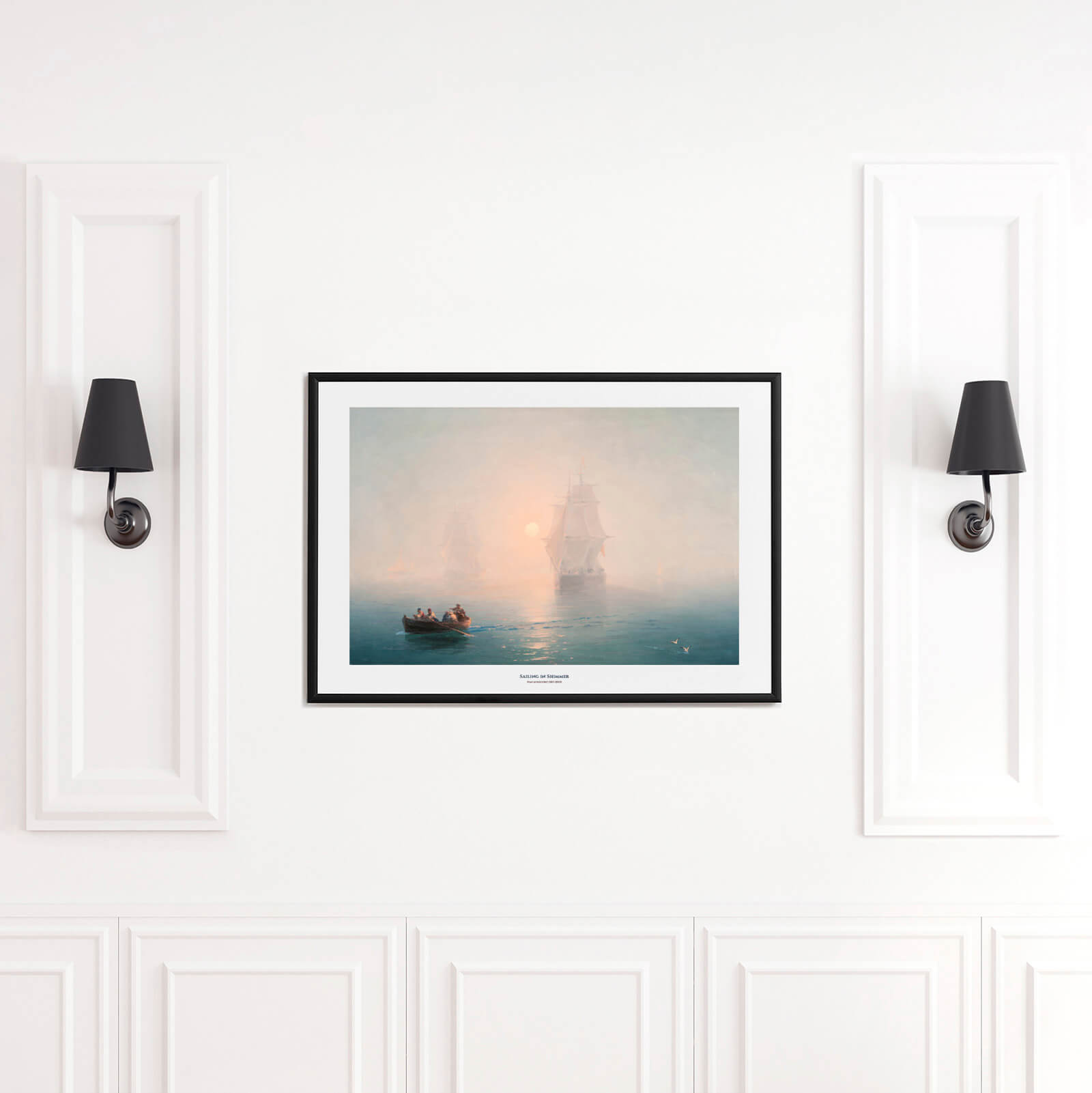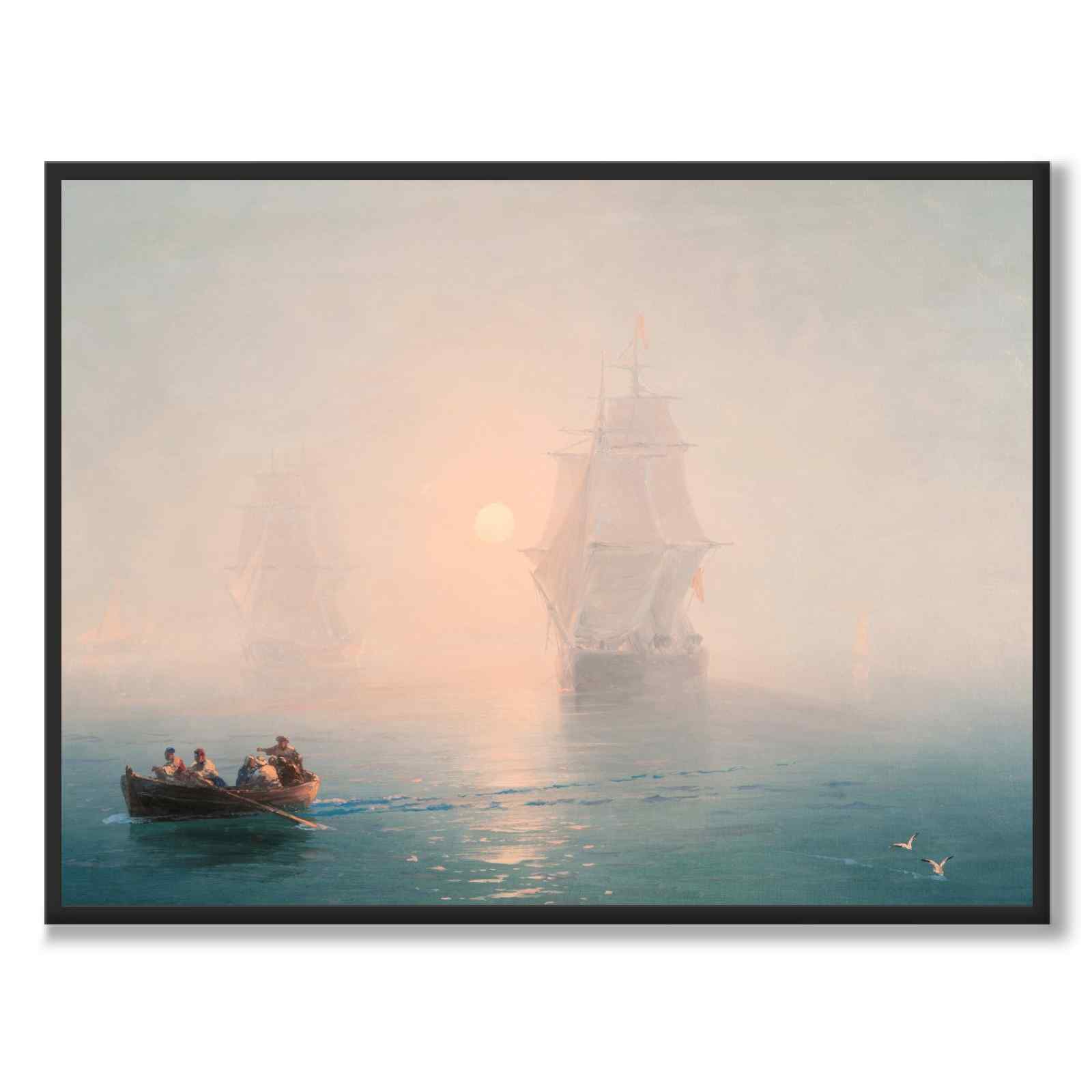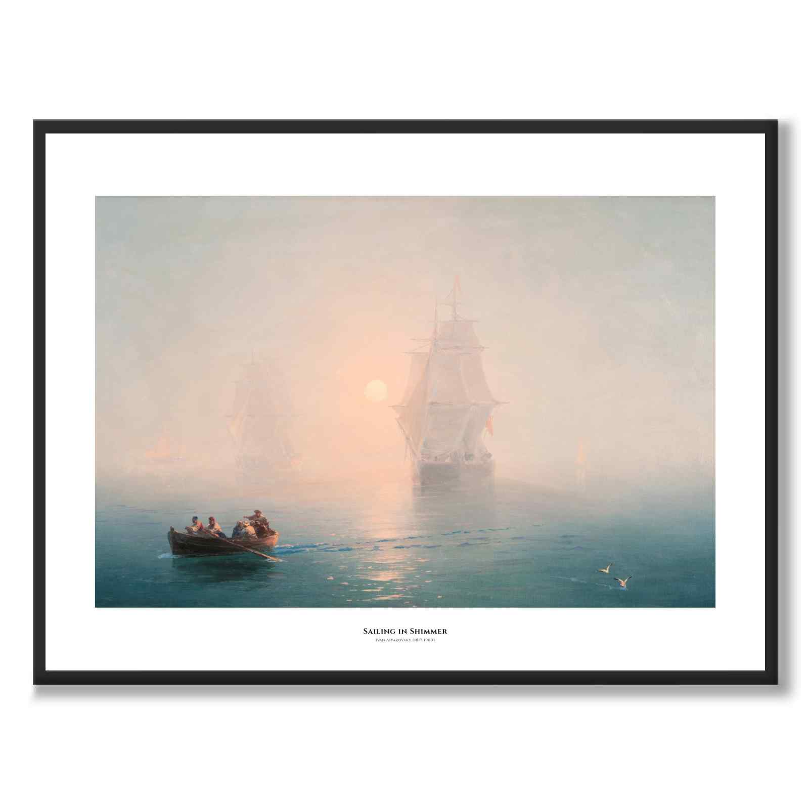 Poster med en vacker tavla målad av marinkonstnären Ivan Aivazovsky under 1800-talet. Motivet visar ett sagolikt soldis över det stilla blå vattnet. Solen lyser mjukt genom dimman och två segelfartyg ligger stilla i bakgrunden. I förgrunden ror ett par män fram över det lugna vattnet.
