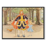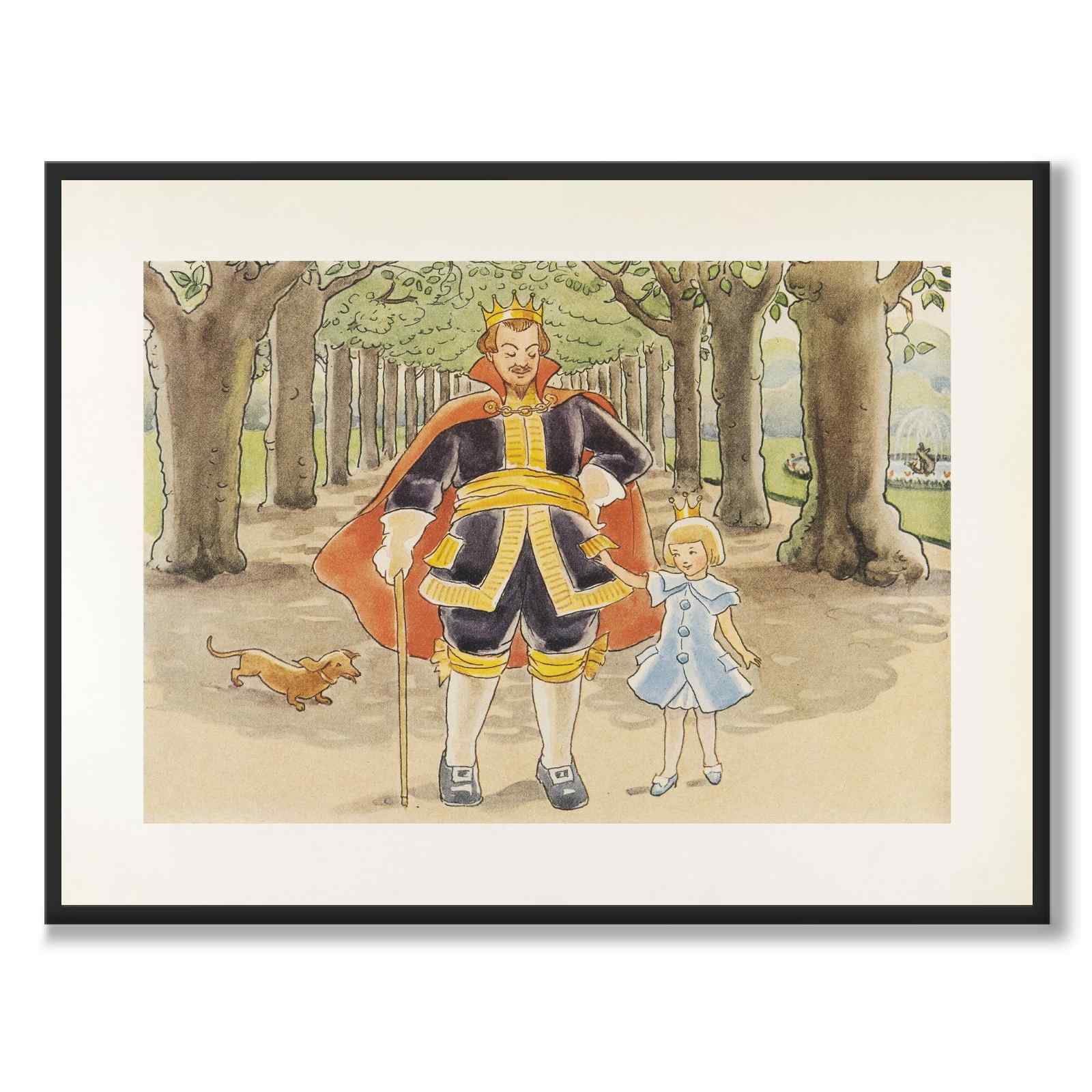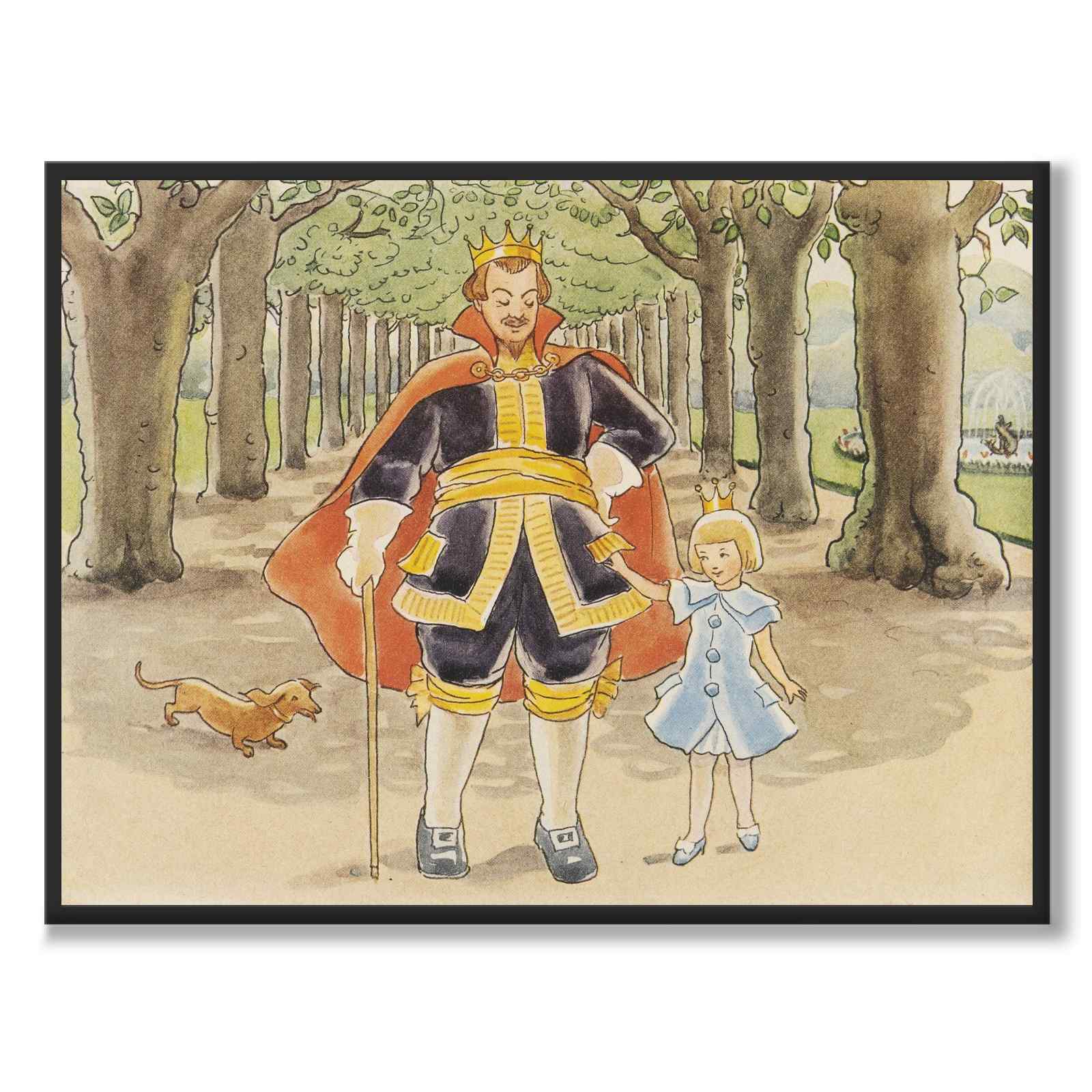 Bilden visar en scen där en kung med krona och röd mantel promenerar genom en allé av träd. Han håller prinsessan i handen, som är klädd i ljusblå klänning och krona. En liten tax springer bredvid dem