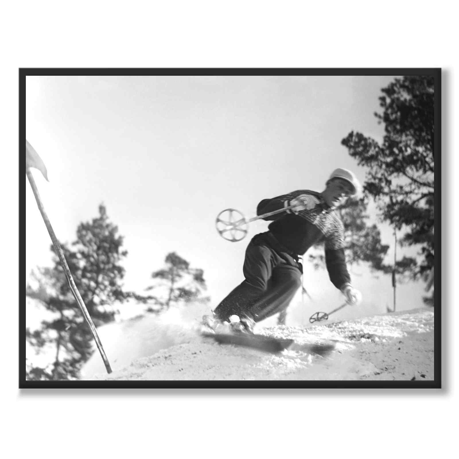Poster med en bild på skidlegenden Hasse Hansson. Hansson tävlar för Åre i tidstypiska skidkläder under Saltsjöbadsdagen den 18 februari 1940 där han i full fart rundar portarna i backen som kantas av åskådare.
