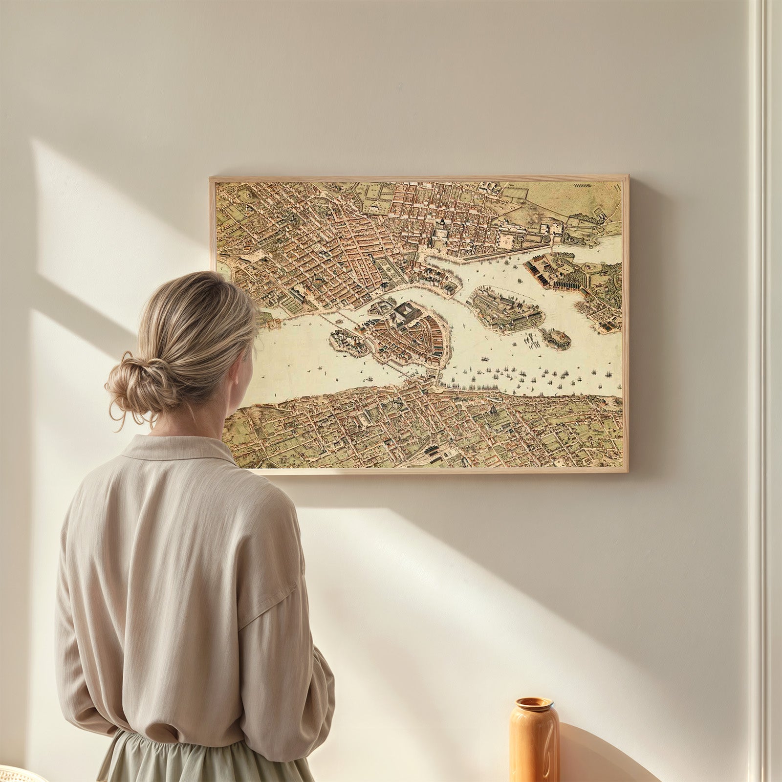 Kartan visar staden sett från luften och de många vattendragen som omger staden, som Mälaren och Saltsjön. Den visar de centrala delarna av Stockholm med den medeltida stadsstrukturen, och man kan skymta områden som Gamla Stan. I utkanterna av kartan syns delar av den växande industrin.