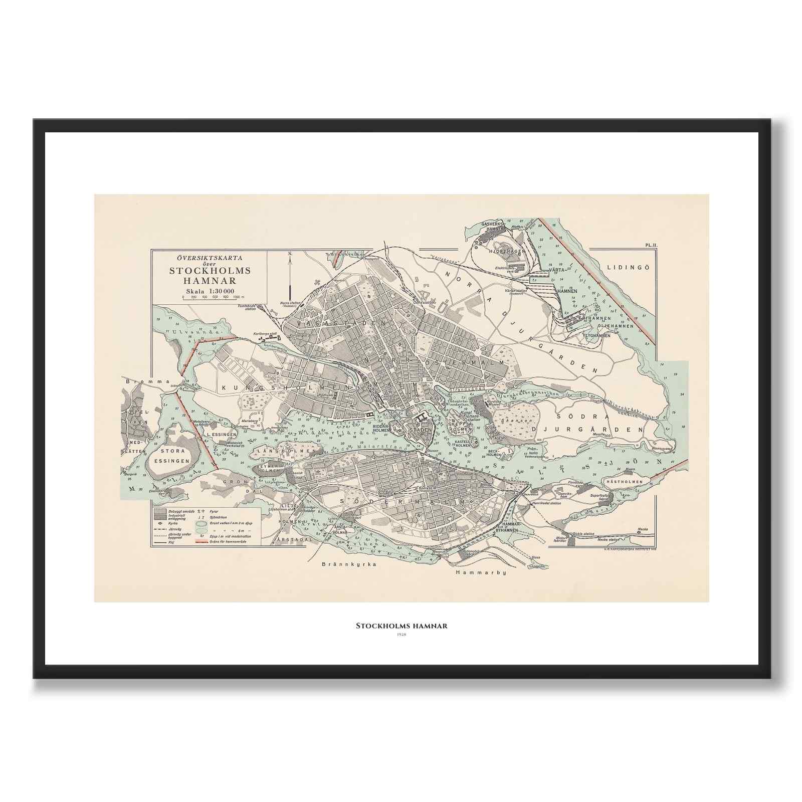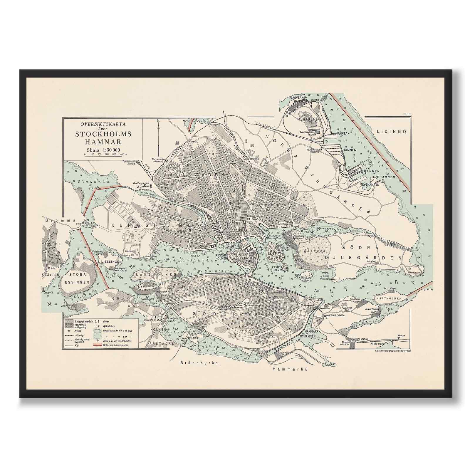 Under den här tiden var Stockholms hamnar en central plats för handel, industri och passagerartrafik. De hanterade en mångfald av skepp och var avgörande för stadens ekonomi och sysselsättning. På kartan kan vi se hur dessa hamnar går genom staden.