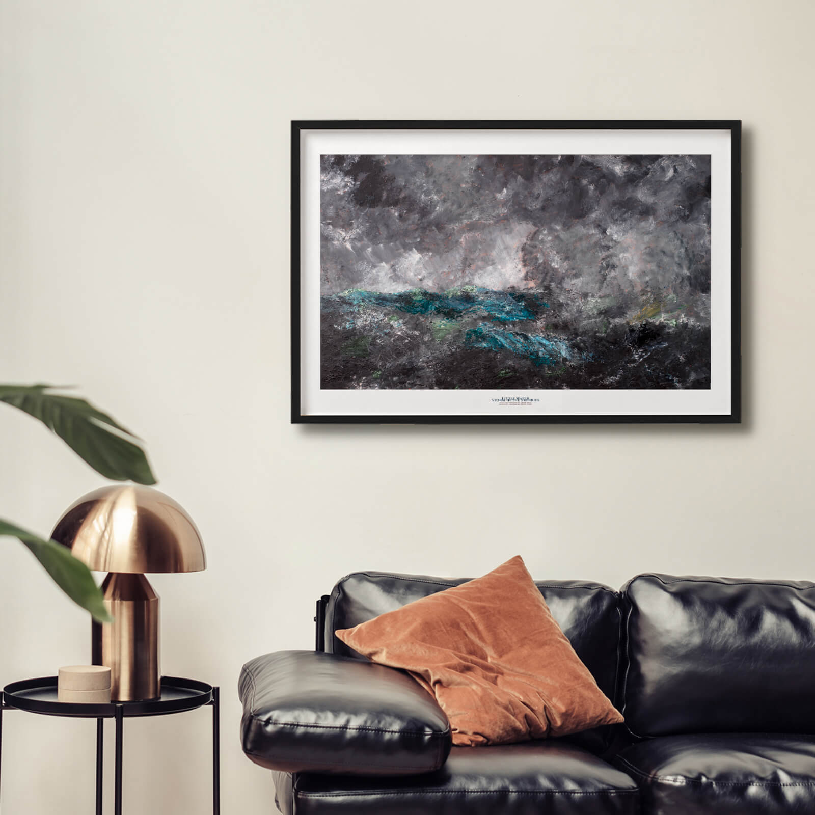 Poster med med ett fantastiskt abstrakt verk i blåa och gråa toner av August Strindberg från 1892. Målningen heter Oväder i Skärgården. Den Flygande Holländaren och visar Stockholms skärgård i ett dramatiskt oväder (engelsk titel Storm in the Skerries. The Flying Dutchman). Det upprörda blågröna havet möter en blåsvart och molntung stormhimmel.