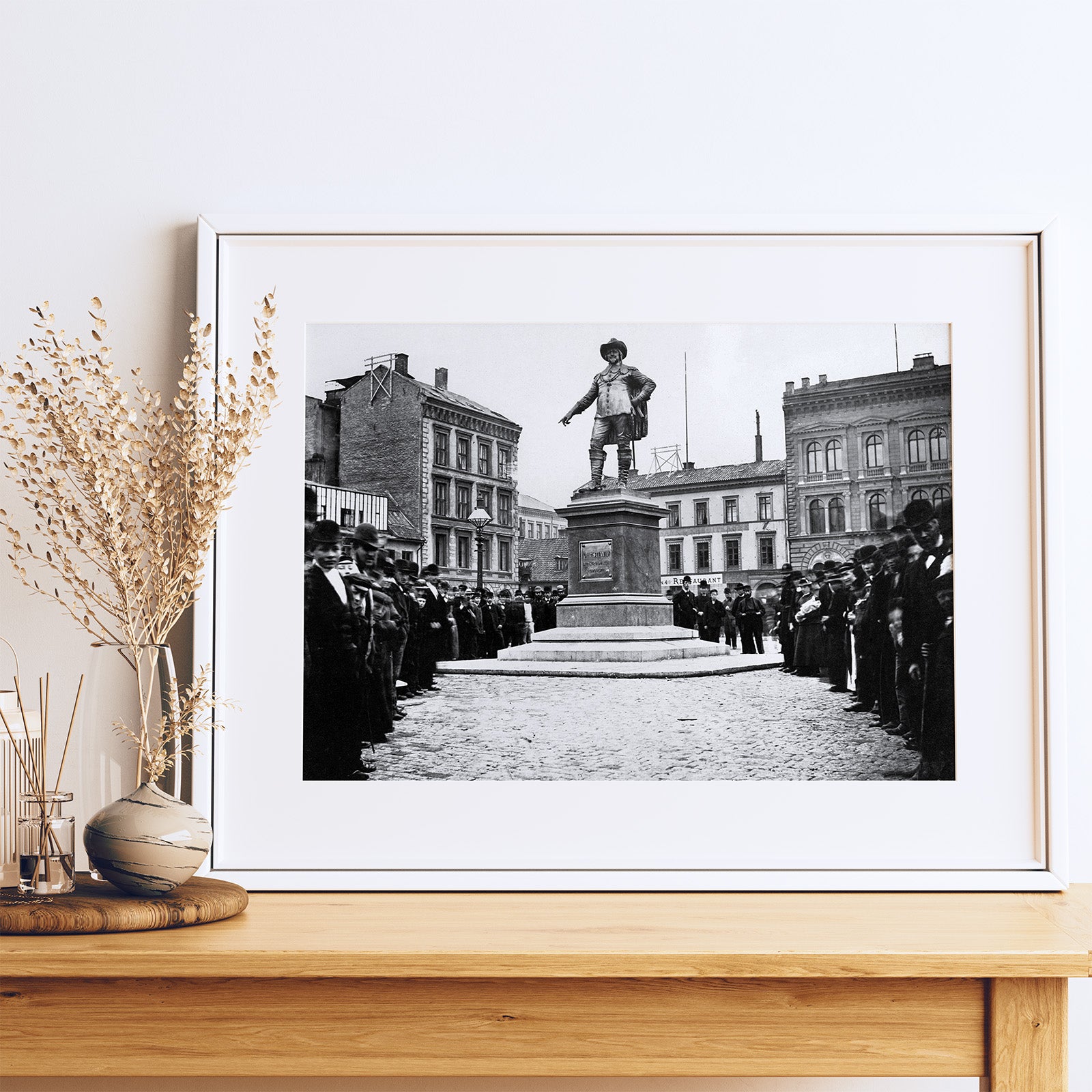I bilden ser vi ett folktätt torg där människor står uppradade runt den nyligen avtäckta statyn, som hedrar Norges grundare av Oslo, kung Kristian IV. Byggnaderna i bakgrunden speglar tidens urbana arkitektur, och scenen fångar en viktig ceremoniell händelse.