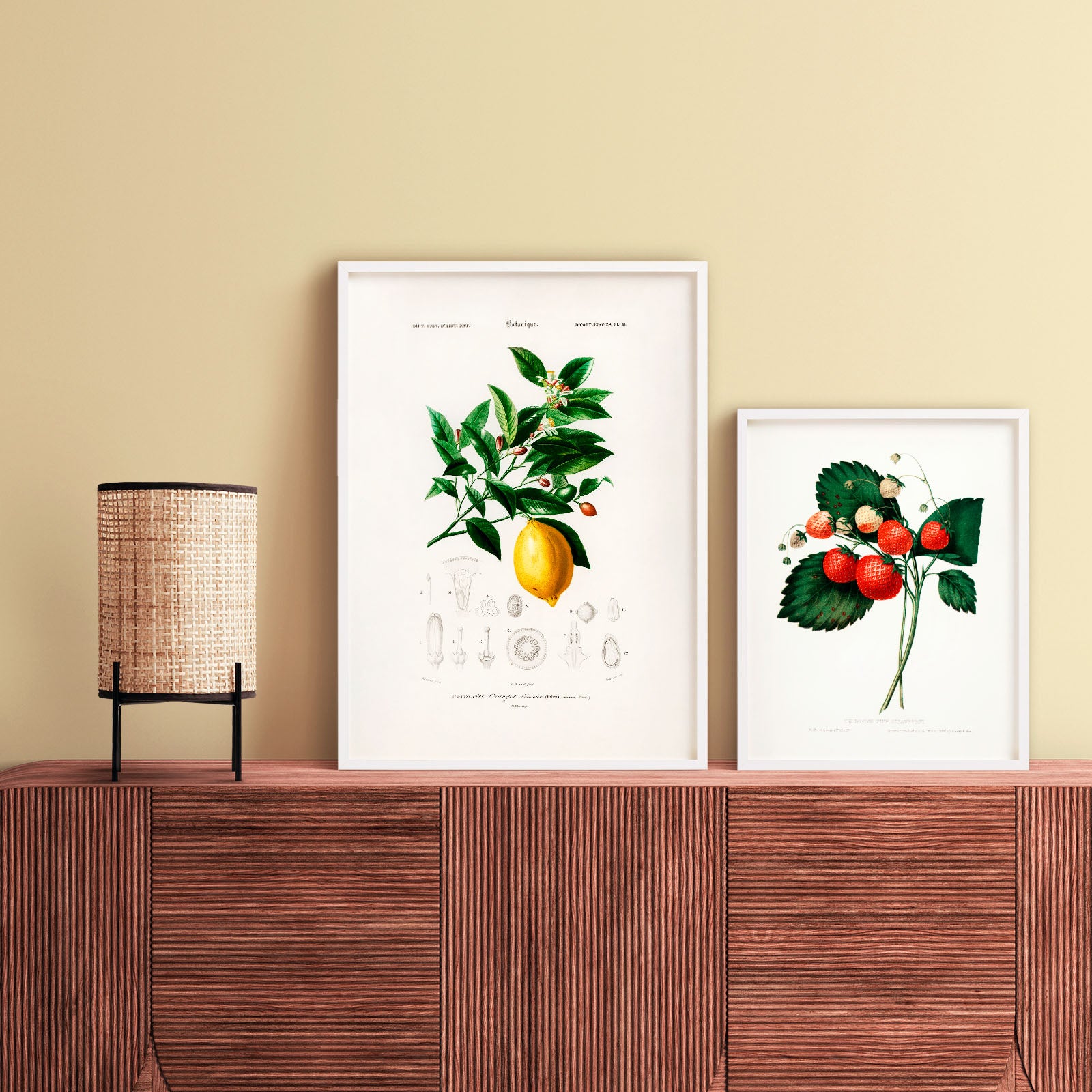 Poster med en klassisk illustration av en jordgubbsplanta från 1852 av Charles Hovey. På bilden ser vi bland annat texten The Boston Pine Strawberry.