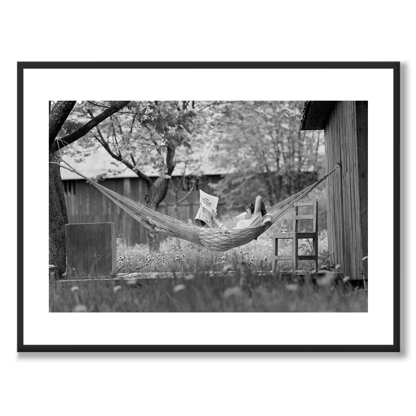 Poster med ett härligt svartvitt fotografi från sommaren 1967. På bilden ser vi en vacker kvinna som ligger i en hängmatta och läser tidningen. Fotot speglar en idyllisk svensk sommardag med en lantlig miljö och vildvuxna blommor.