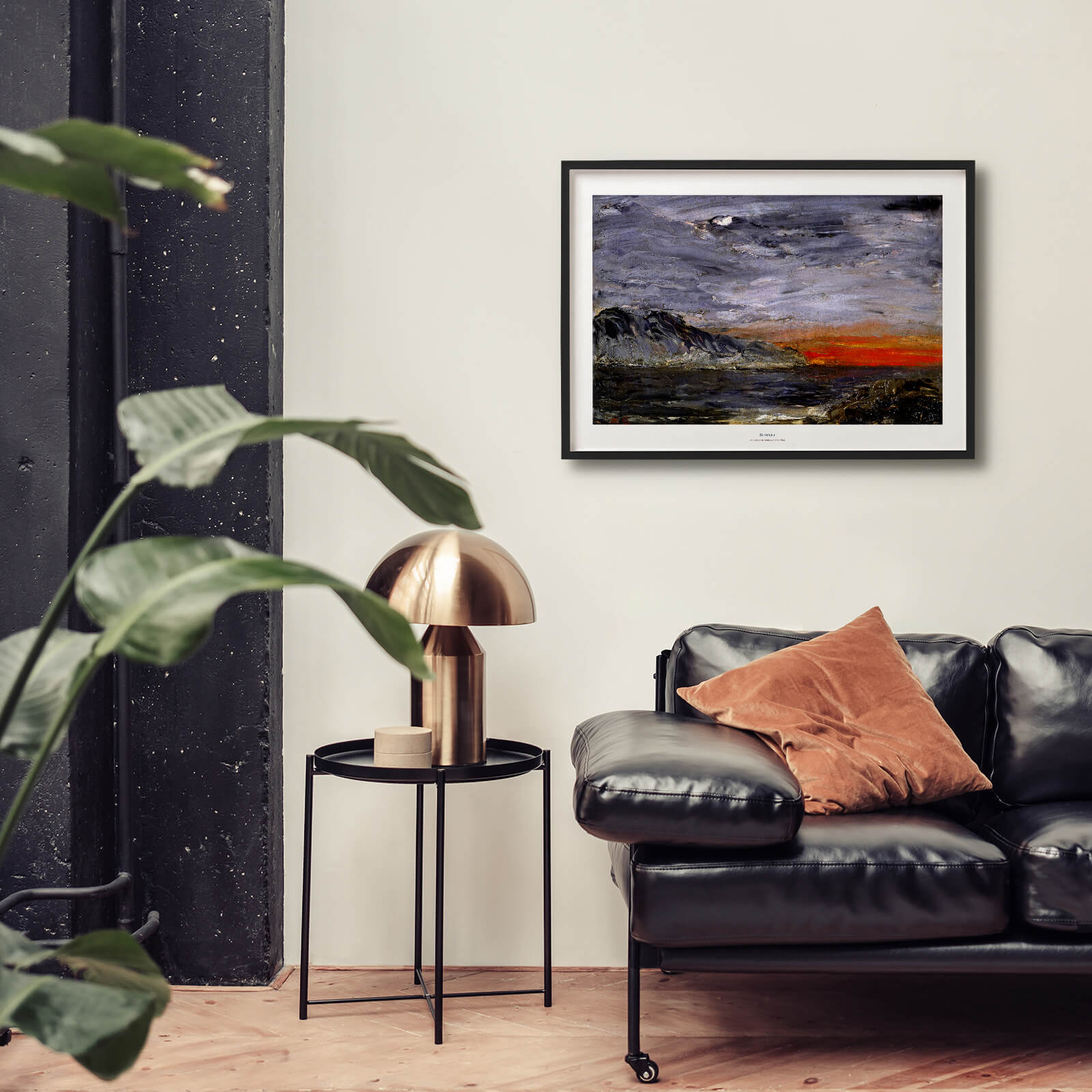 Poster med en målning av August Strindberg från 1892. Målningen heter Solnedgång och visar en klarorange sol som går ned bortom hav och klippor i skärgården.
