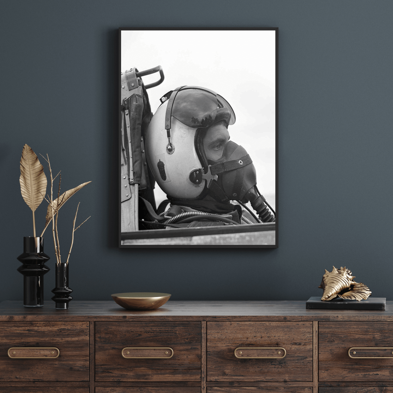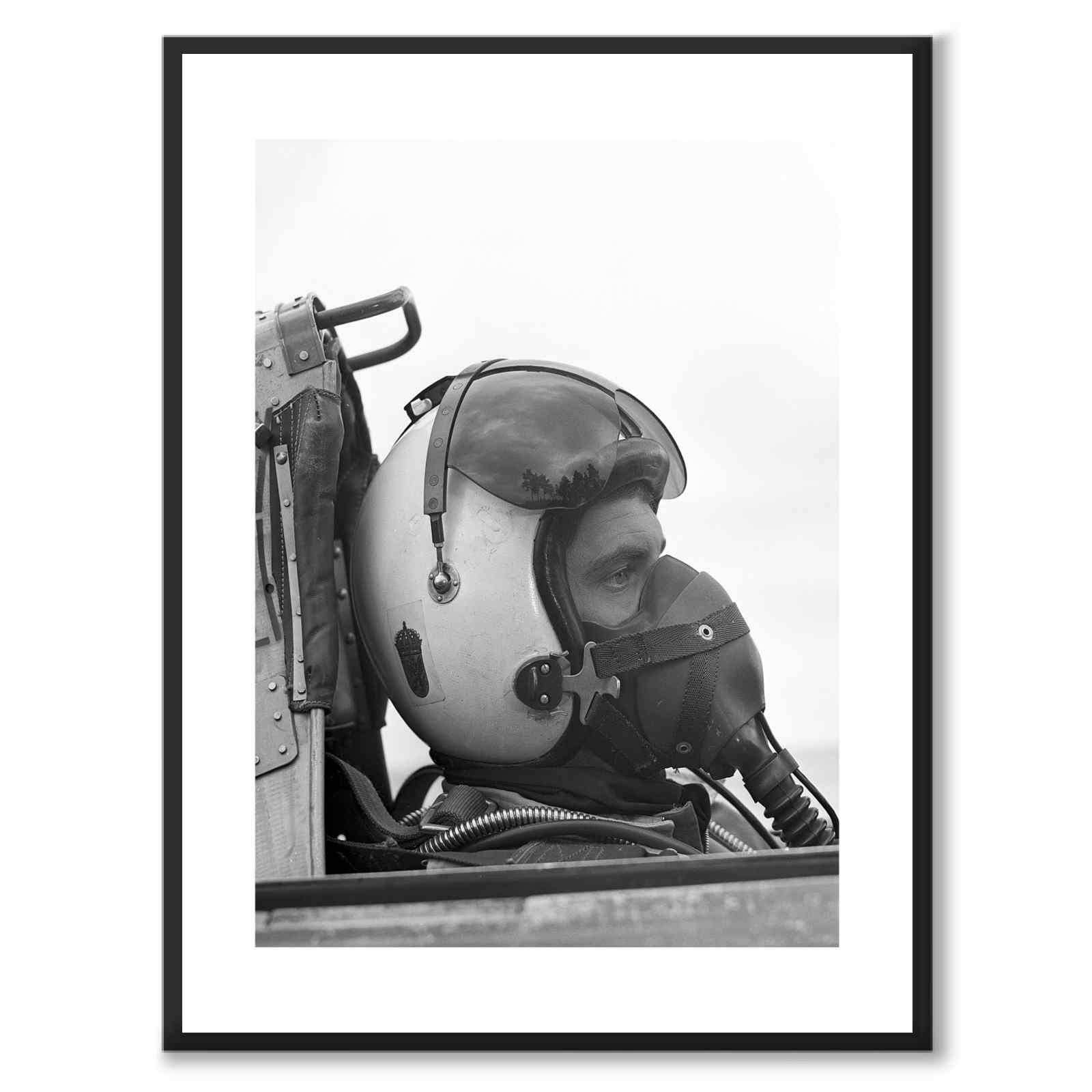 Poster med ett svenskt flygvapen år 1964. En pilot förbereder sig för starten av ett militärt flygplan av typen Lansen vid flygflottiljen F7 i Såtenäs.