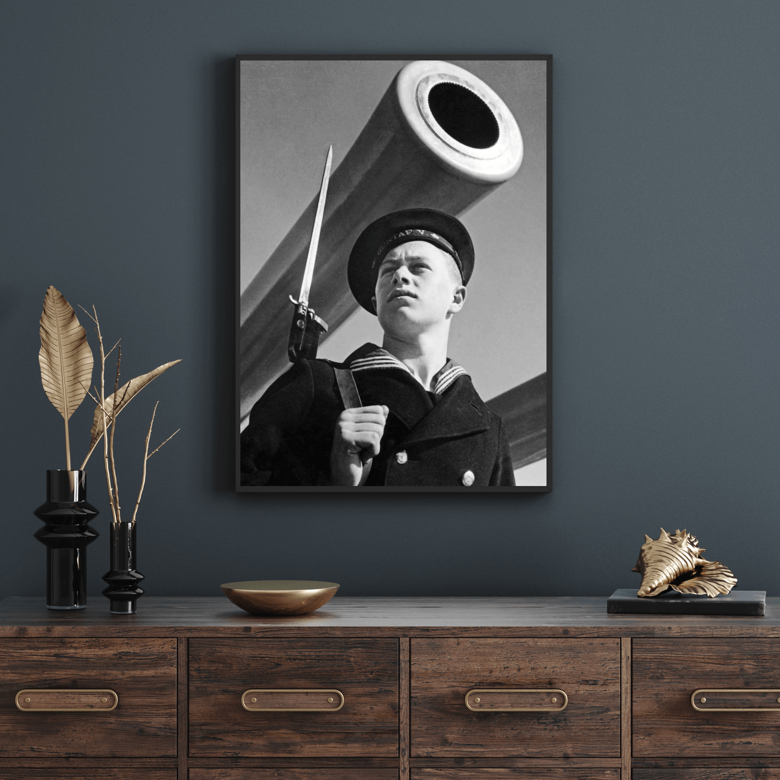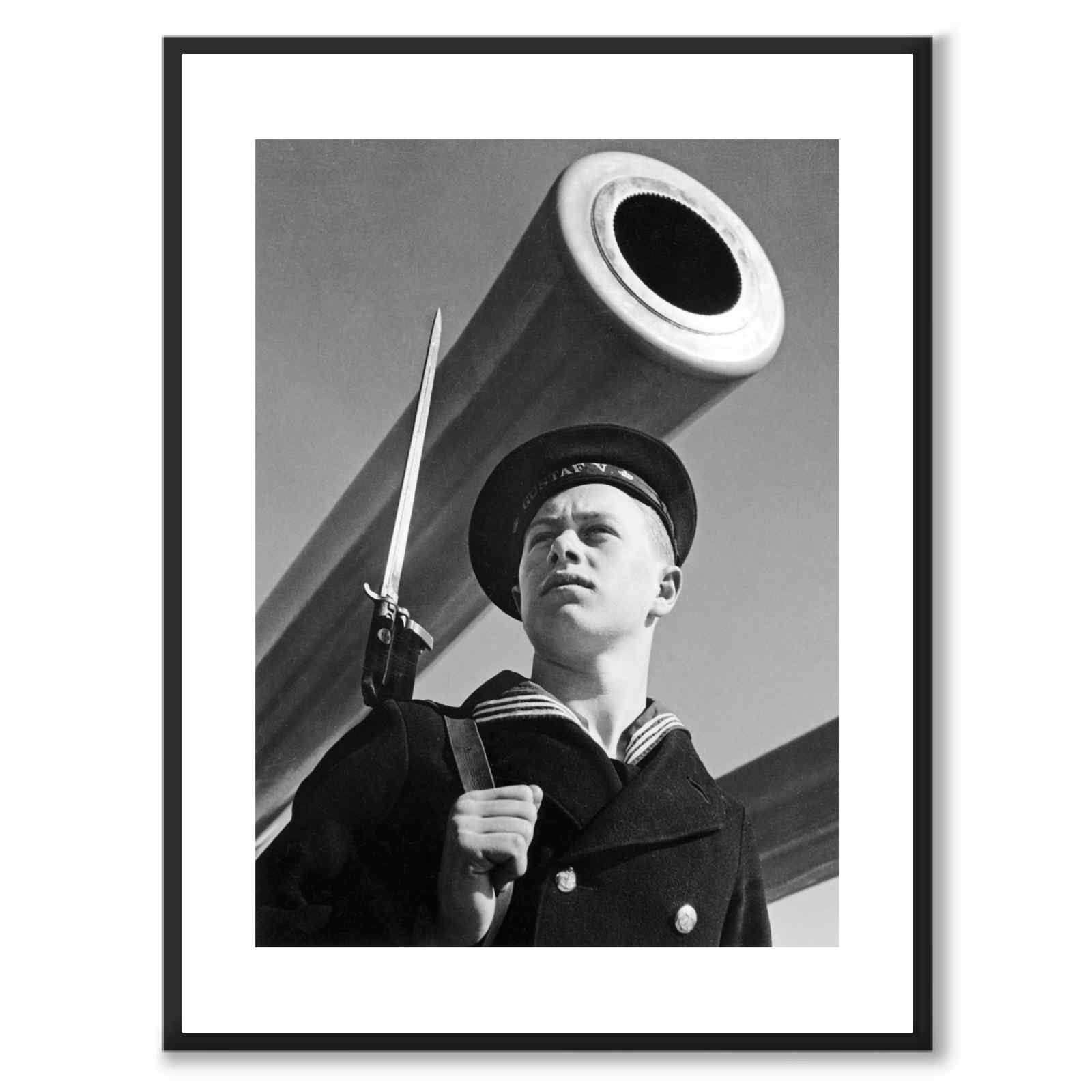 Poster med motivet Svenska marinen från 1940-talet. Fotografiet är taget på en ung man blickandes ut, klädd i sin uniform.