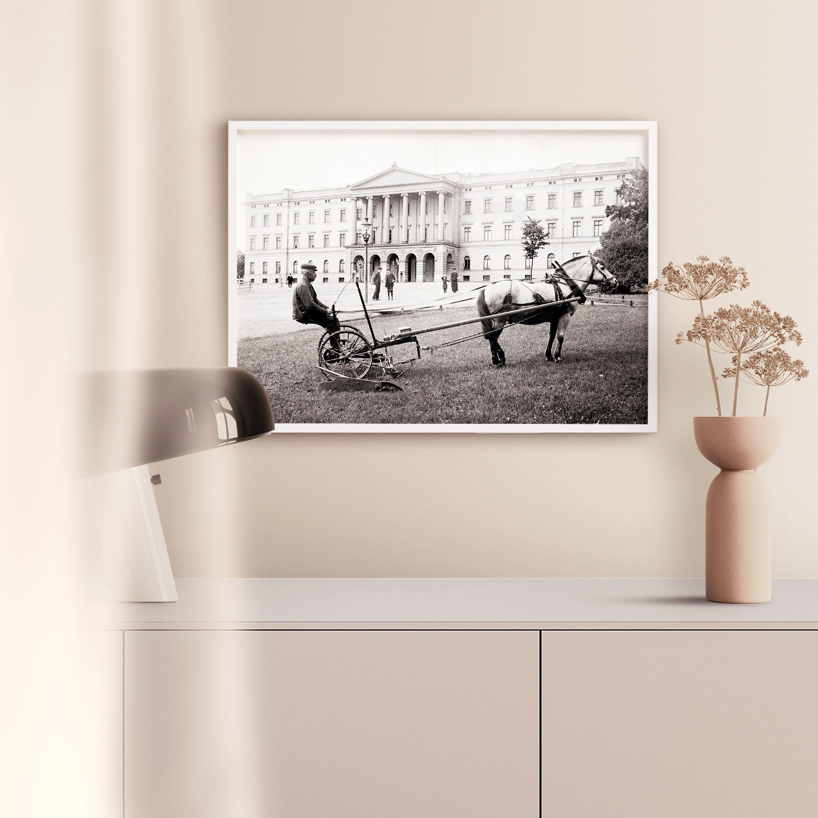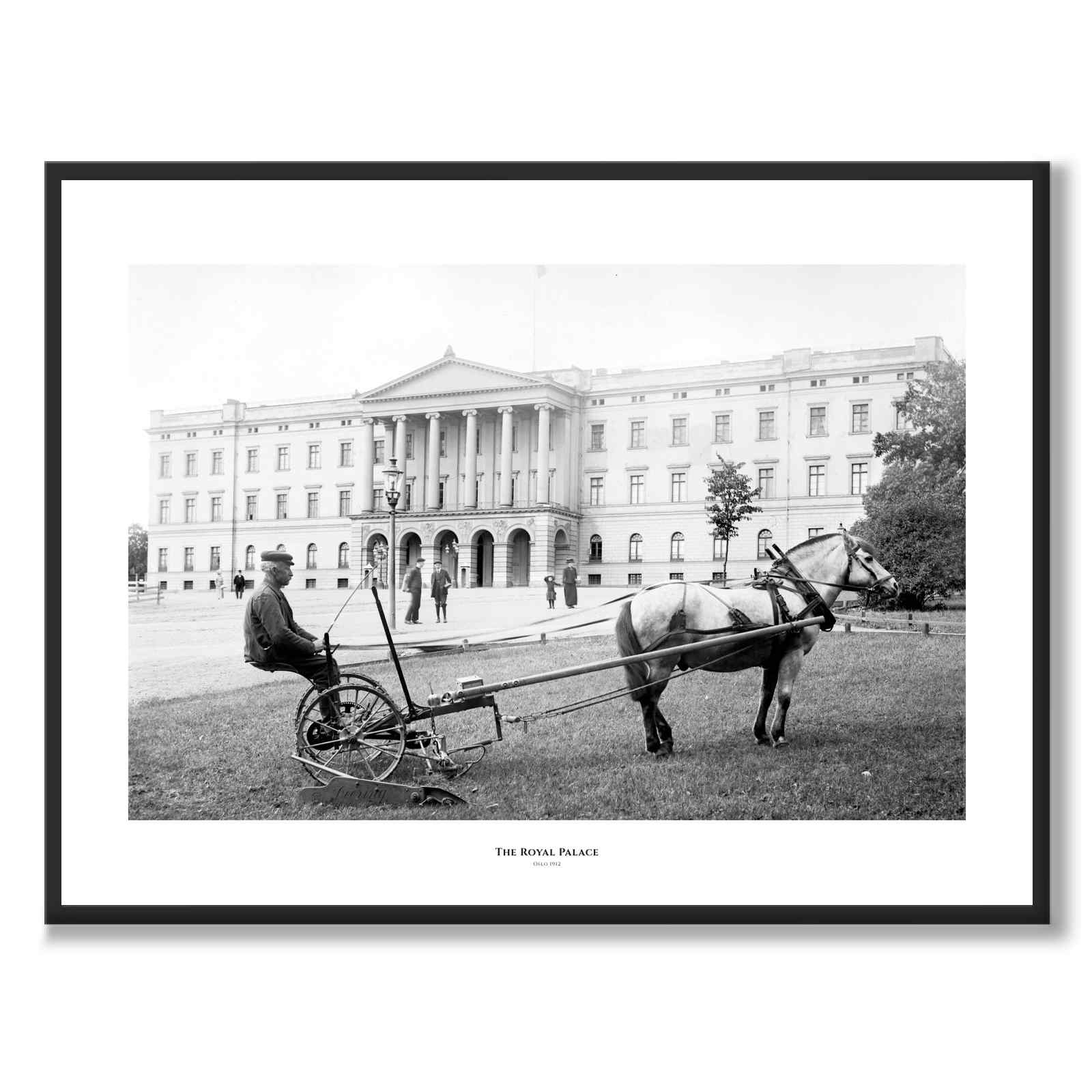 Poster med ett fotografi av en hästdragen slåttermaskin i Slottsparken vid det Kungliga Slottet i Oslo, Norge år 1912.