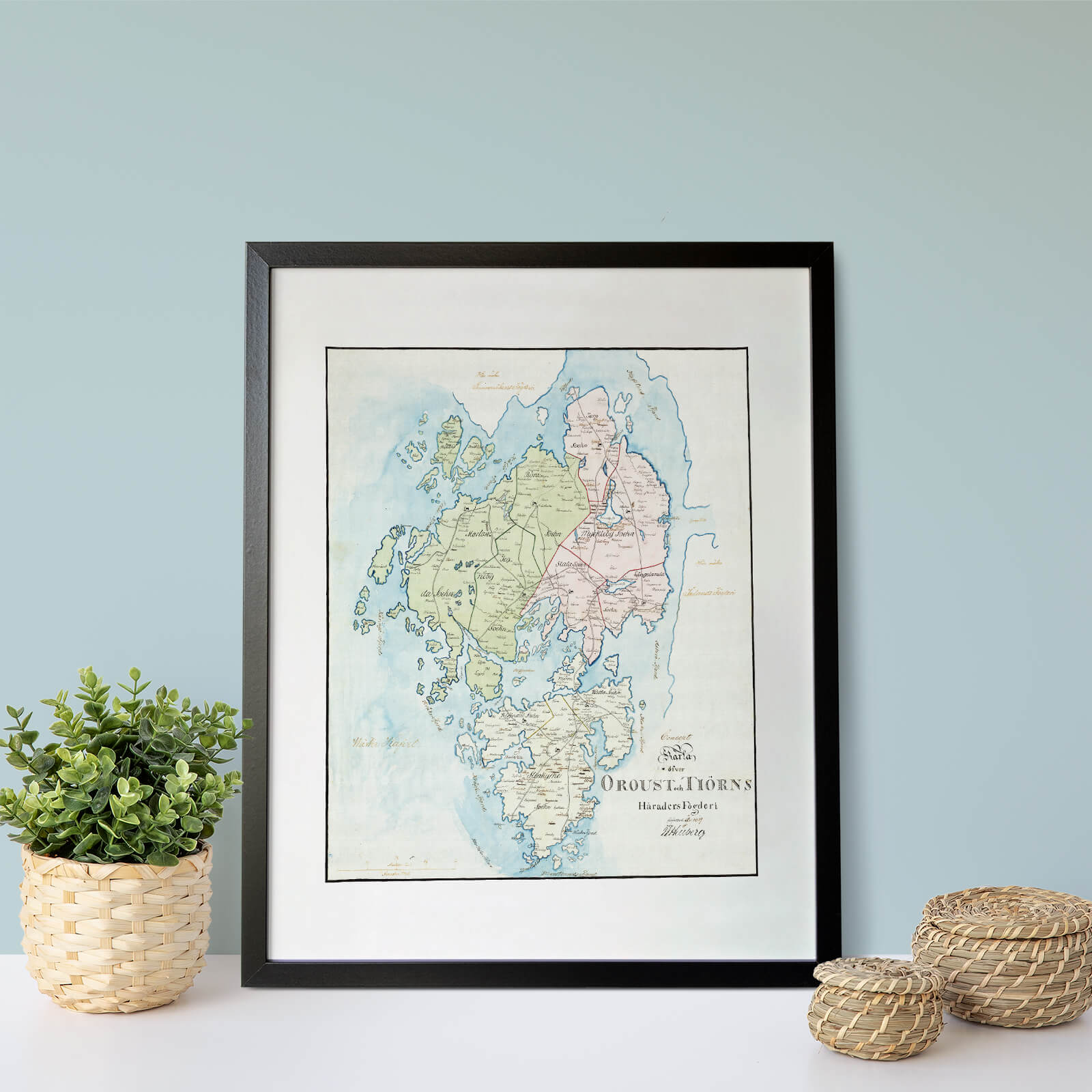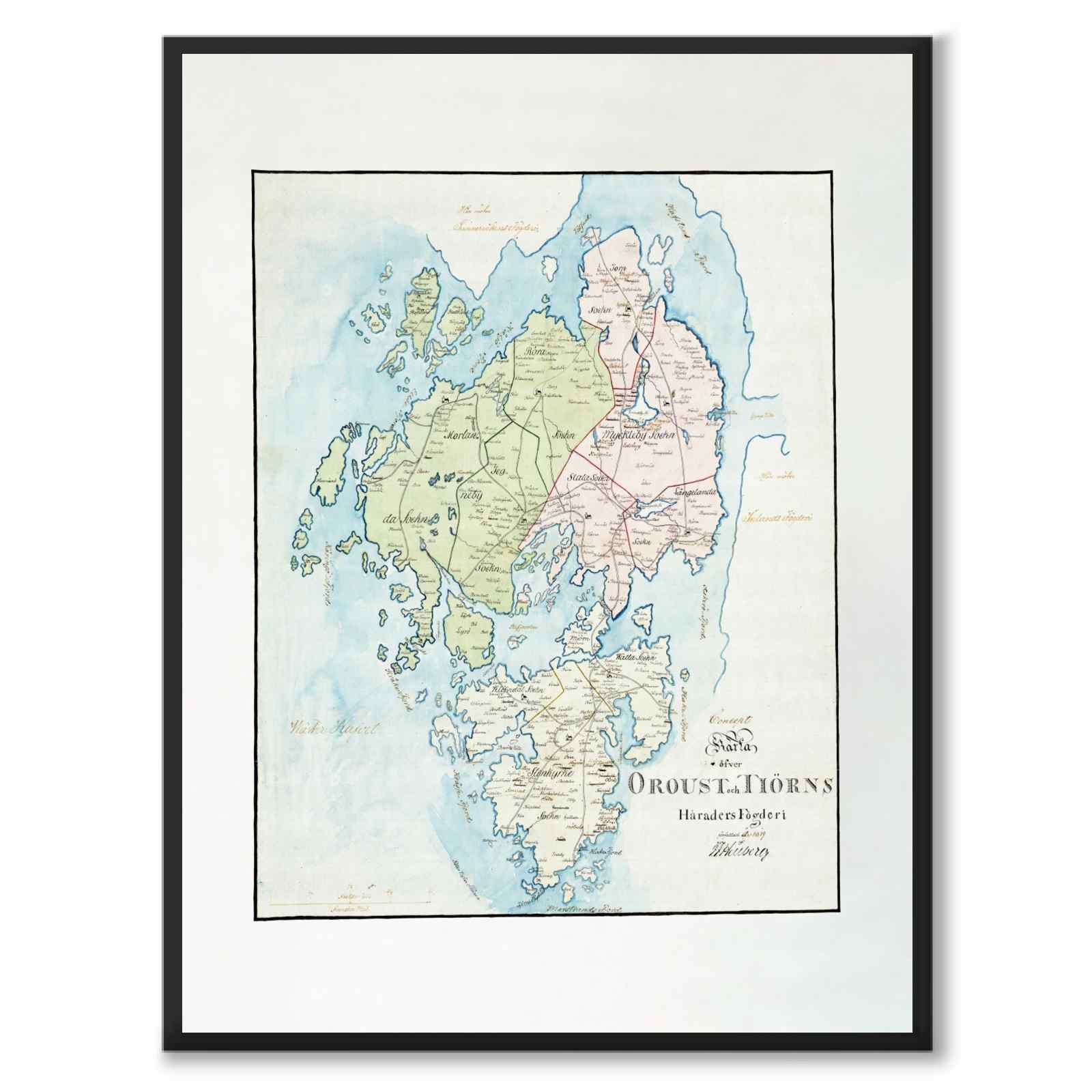 Poster med en gammal karta över Tjörn och Orust i Bohuslän, Sverige. På kartan ser vi texten: "Conceptkarta öfver Oroust och Tiörns häraders fögderi författad år 1819 af J. J. Hellberg". Kartan visar allt från ser vi allt från Åstol och Dyrön i söder till Torp, Flatön och Skaftö i norr.
