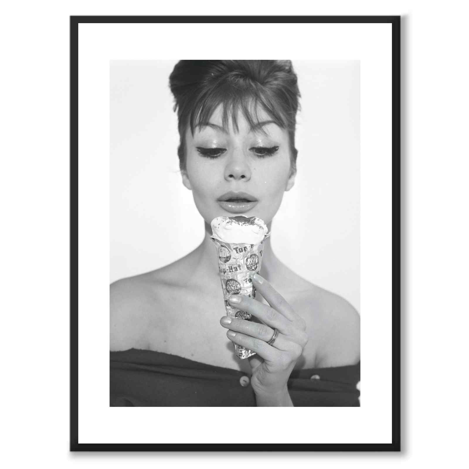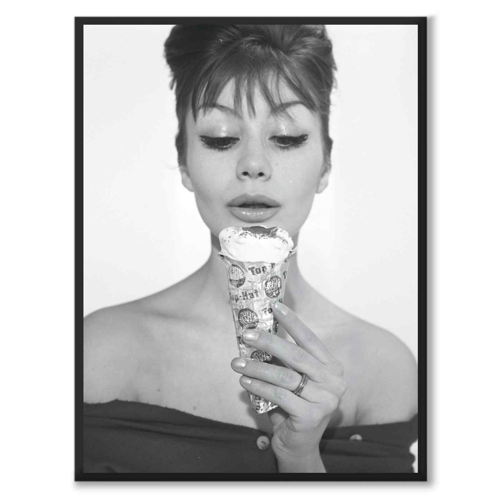 Poster med en kvinna som äter GB-glassen Top Hat i Sverige på 1960-tal. Glassen står i fokus och hon är lite lätt suddig i bakgrunden.
