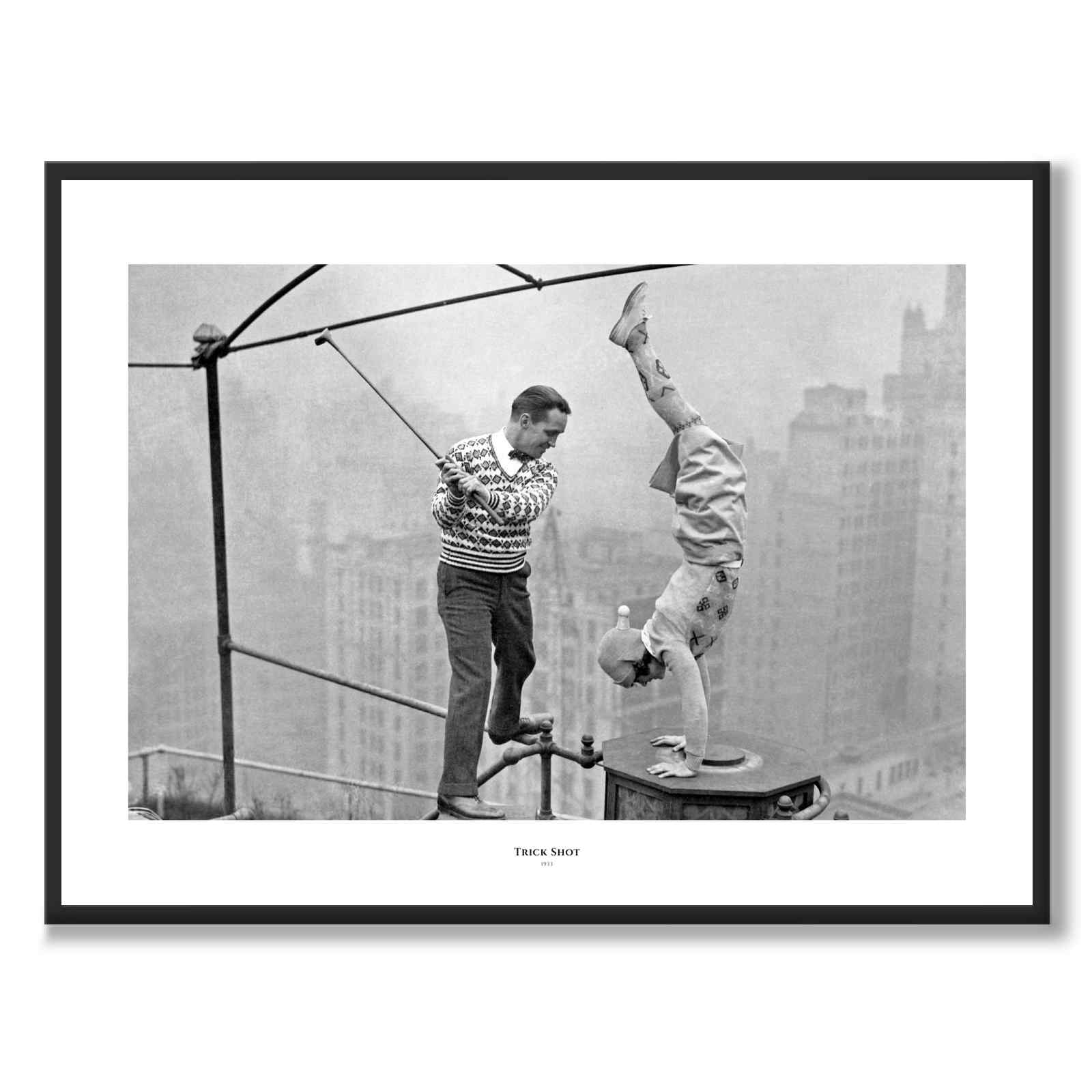 Poster med en rolig bild på ett golfproffs som står högt upp på ett höghus och ska slå ut. Golfbollen balanseras på huvudet av en gymnast som står på händer precis vid kanten.