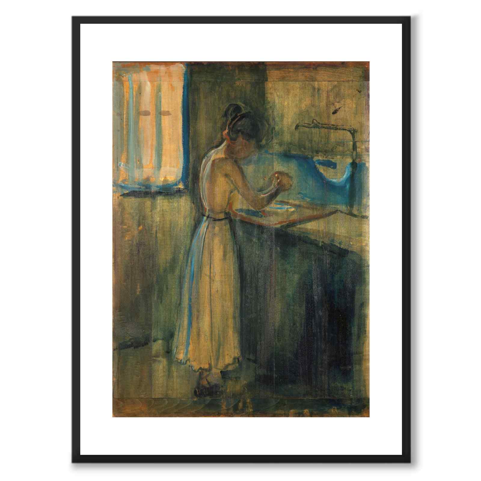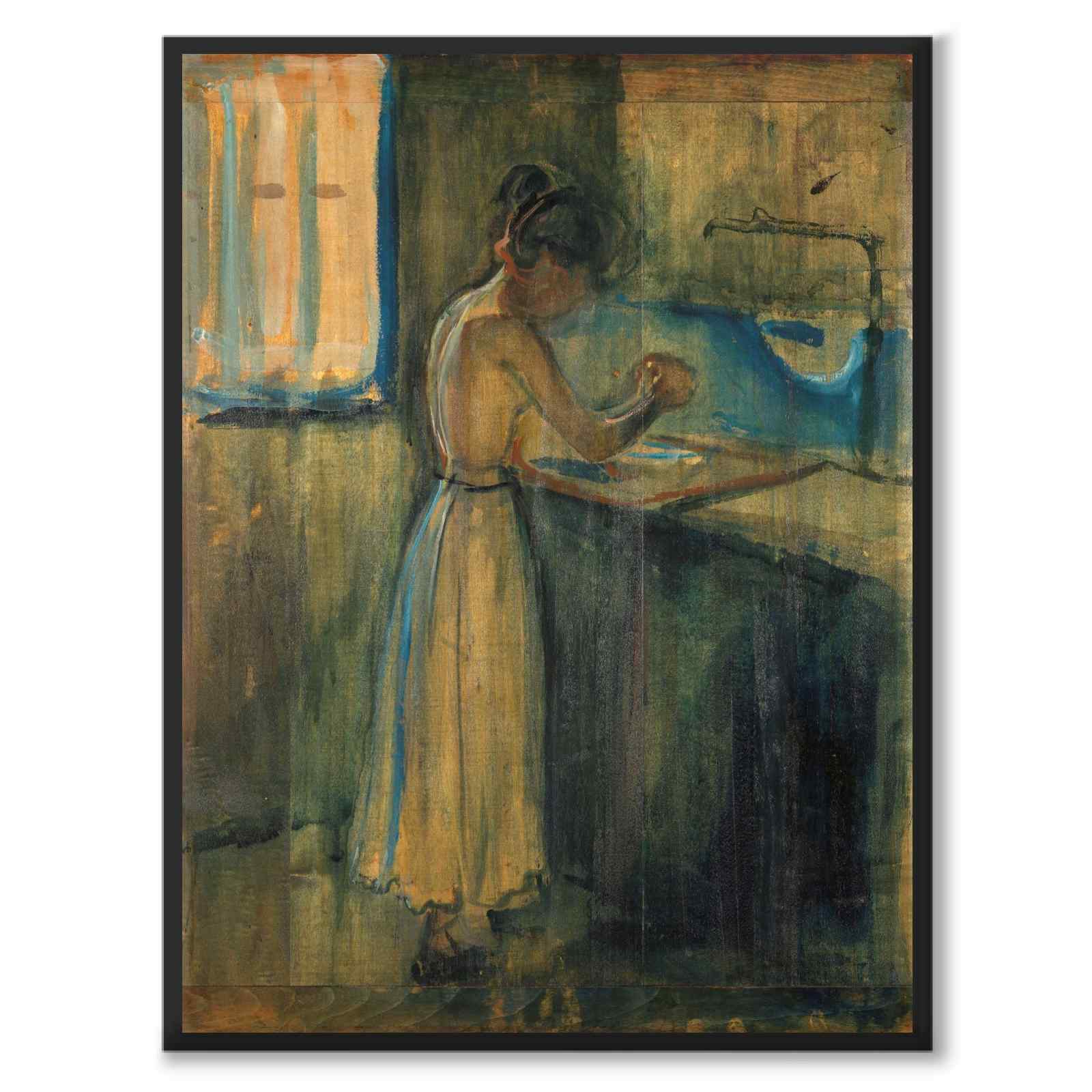 Målningen skildrar en ung kvinna som står vid ett diskhon och tvättar sig i ett enkelt rum. Munch använder dämpande färger och mjuka penseldrag för att fånga känslan av intimitet och stillhet.