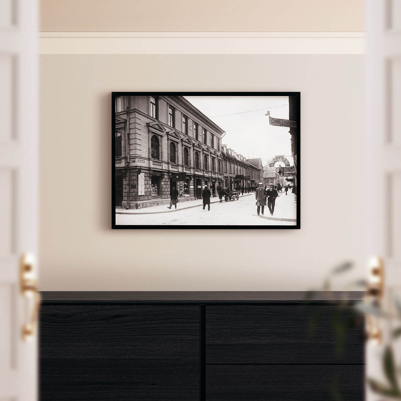Poster med bild från 1902 på Vaksalagatan i Uppsala. Bilden är tagen i korsningen Vaksalagatan - Dragarbrunnsgatan.