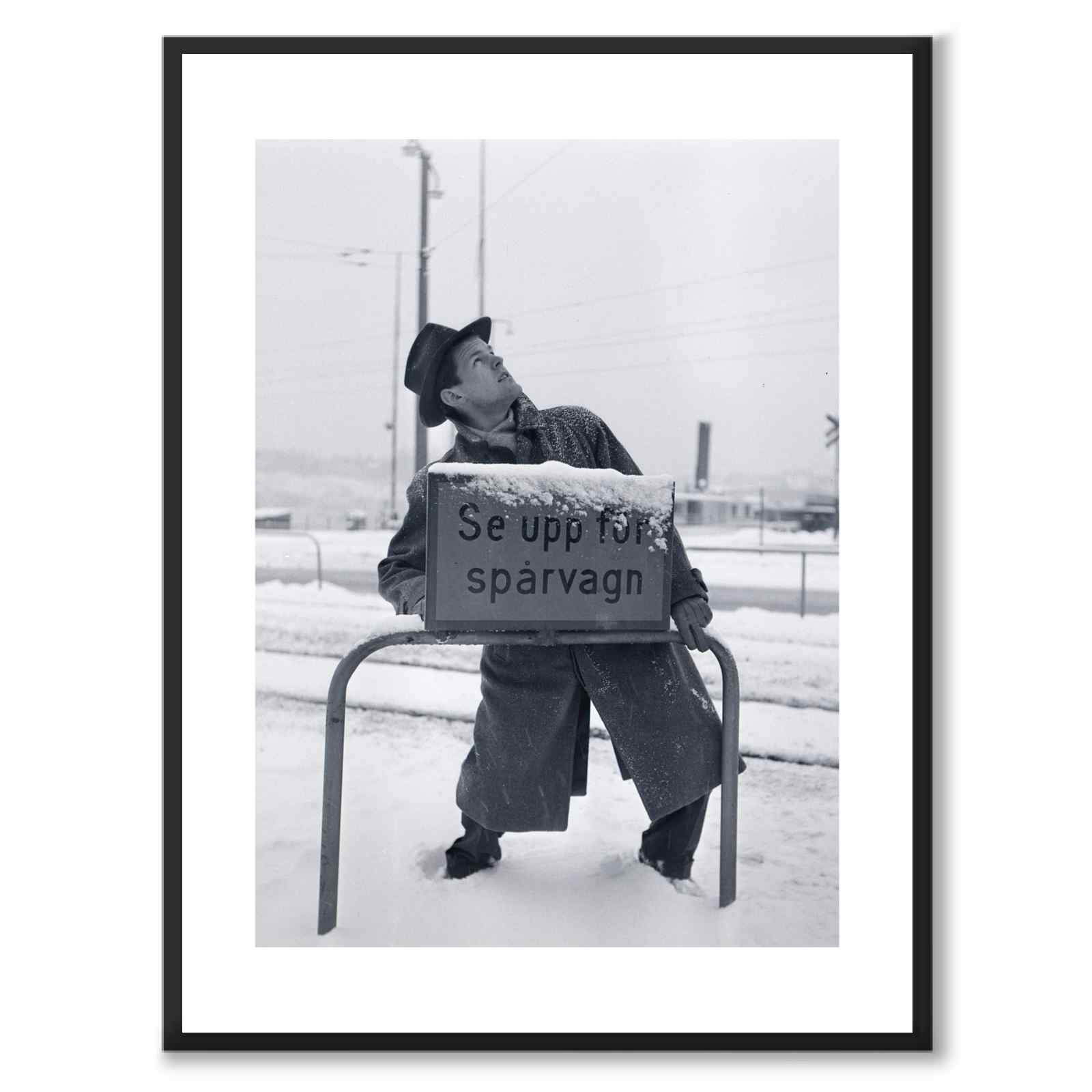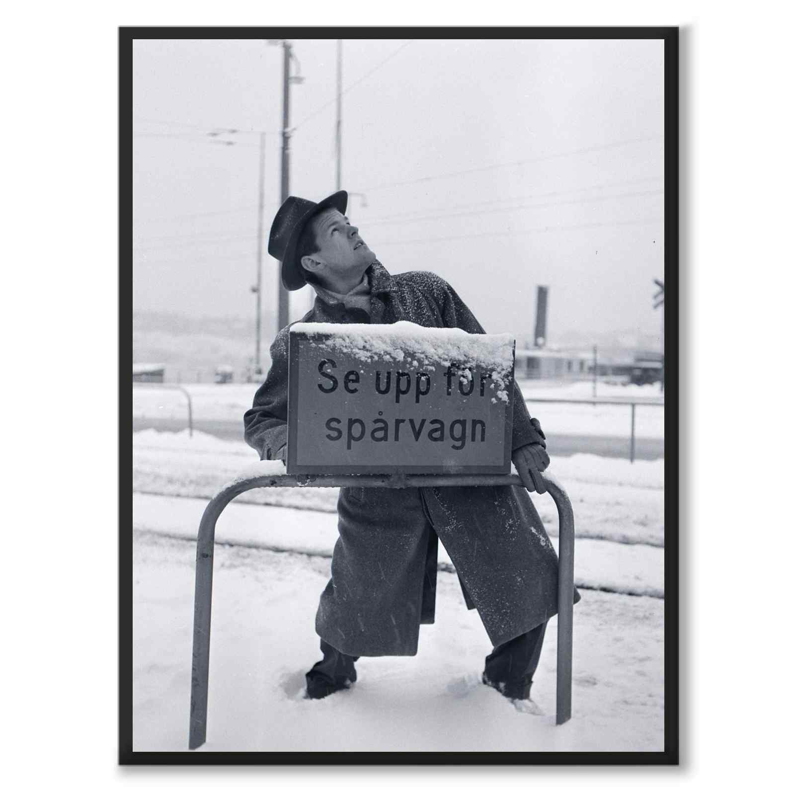 Poster med motiv av Varning för spårvagn från 1940. Fotografiet visar en man i ett snöklätt Sverige som tittar upp mot himlen. Snön täcker hans fötter medan han står och håller i varningsskylten för spårvagnar.