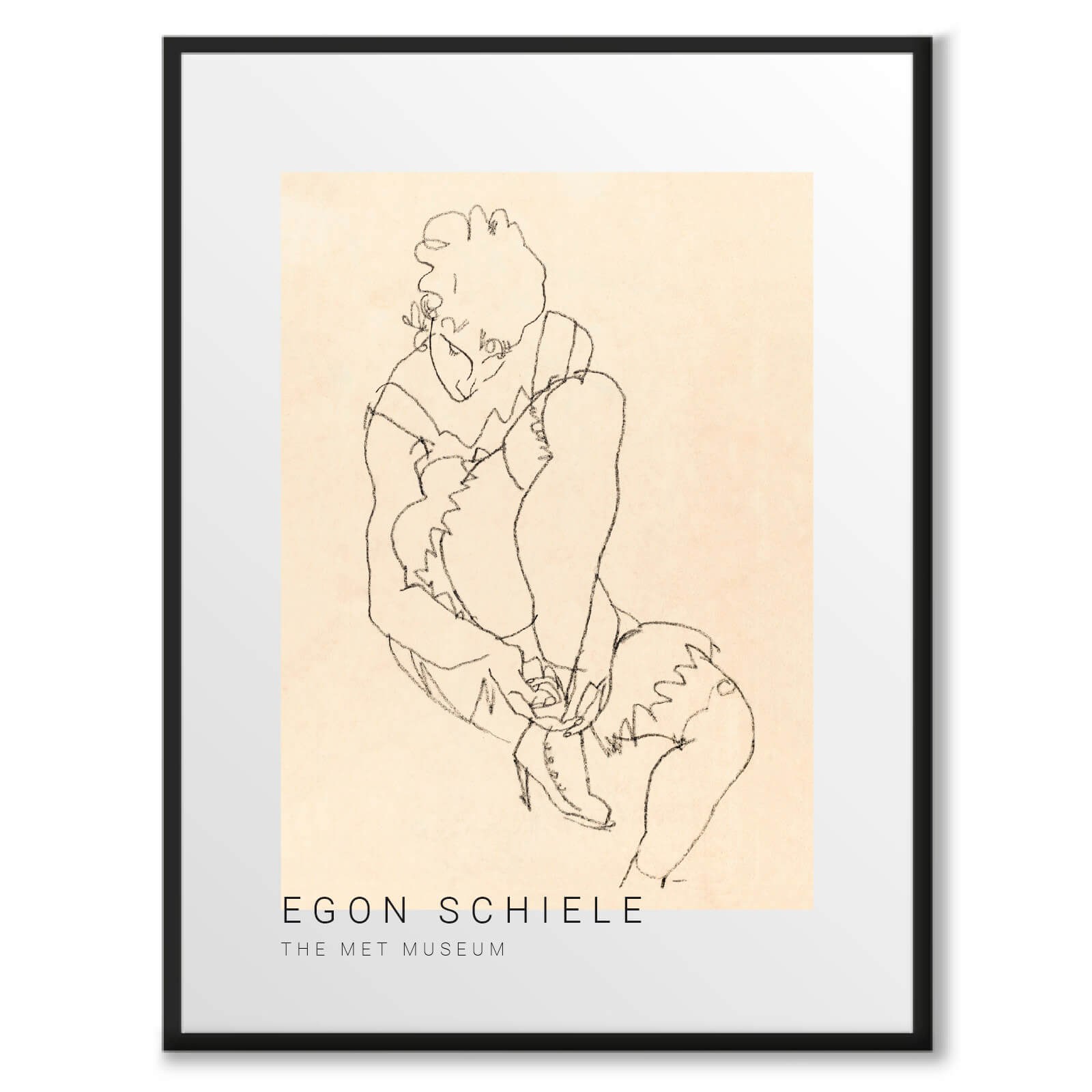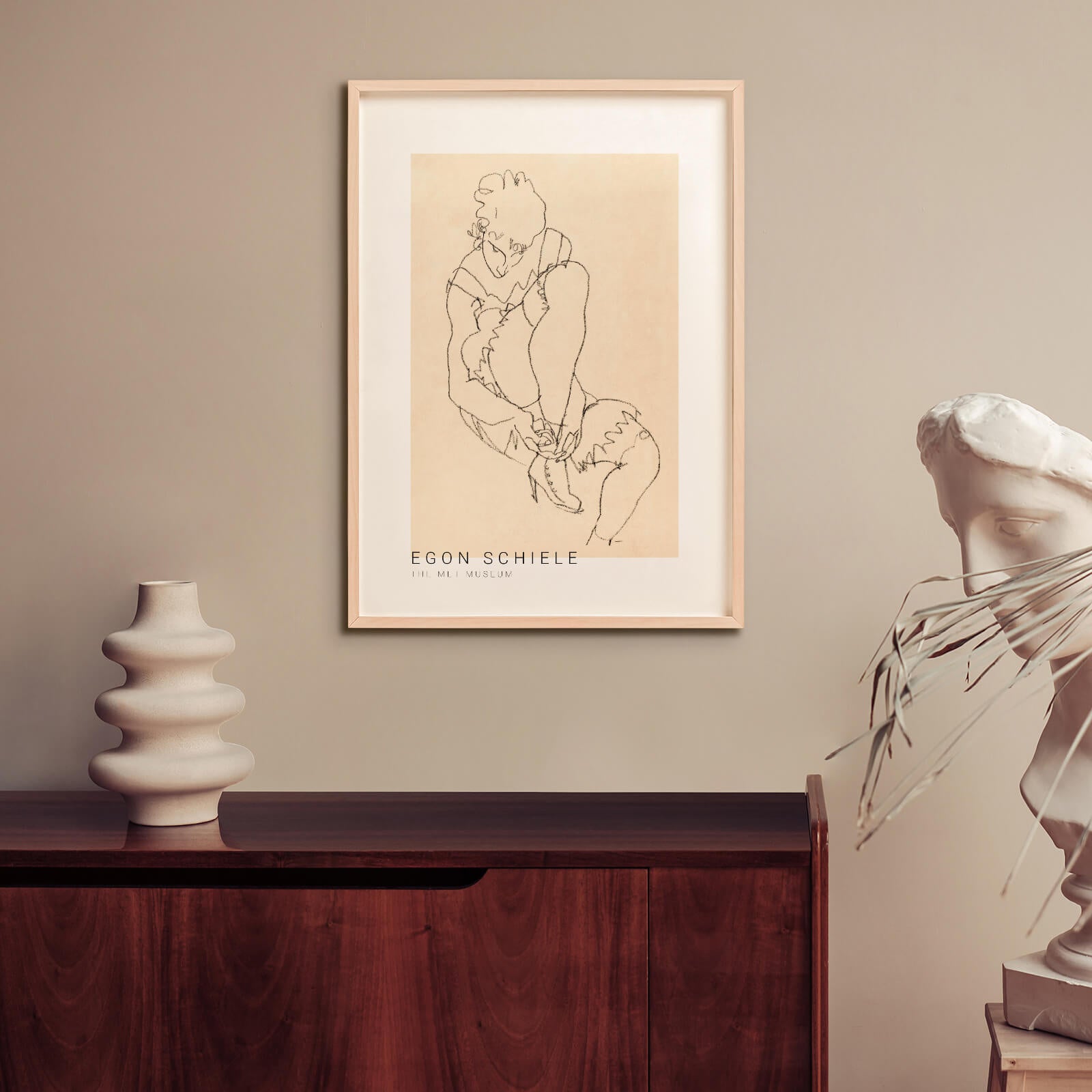 Poster med en linjeillustration av Egon Schiele. Motivet heter Woman Buttoning Her Shoes (1915). Motivet visar en vacker kvinna i 1910-talets underkläder som knyter sina klackskor. Originalet finns vid The MET Museum i New York.